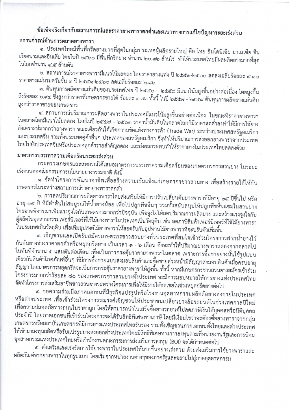 4) ขอความร่วมมือบริษัทหรือภาคเอกชนที่มีธุรกิจแปรรูปหรือโรงงานอุตสาหกรรมผลิตล้อยางส่งขายในต่างประเทศและหรือภายในประเทศ เพื่อขอให้เข้าร่วมรณรงค์เชิญชวนให้ประชาชนเปลี่ยนยางล้อรถยนต์ในช่วงเทศกาลปีใหม่เพื่อความปลอดภัยทางถนนในราคาถูก โดยให้ประชาชนได้สิทธิ์ทำใบเสร็จซื้อยางล้อรถยนต์ไปลดภาษีเงินได้บุคคลหรือนิติบุคคลประจำปี ในขณะที่บริษัทเอกชนหรือโรงงานที่เข้าร่วมโครงการผลิตล้อรถยนต์ราคาถูกก็จะได้สิทธิพิเศษทางภาษีเช่นกัน โดยมีเงื่อนไขและหลักฐานว่าได้ซื้อยางพาราจากกลุ่มเกษตรกรหรือสถาบันเกษตรกรที่มี กยท.รับรองโดยตรงด้วย รวมทั้งให้เชิญชวนบริษัทเอกชนทั้งของไทยและต่างประเทศให้เข้ามาลงทุนผลิตหรือรับแปรรูปยางส่งไปขายต่างประเทศ โดยมีสิทธิพิเศษทางการลงทุนตามที่หน่วยงานรัฐและการนิคมอุตสาหกรรมแห่งประเทศไทยหรือสำนักงานคณะกรรมการส่งเสริมการลงทุน (BOI) จะได้กำหนดต่อไป และ 5) ส่งเสริมและเร่งรัดการใช้ยางพาราในประเทศให้มากขึ้นอย่างเร่งด่วน โดยส่งเสริมการใช้ยางพาราและผลิตภัณฑ์จากยางพาราในทุกรูปแบบ โดยเริ่มจากหน่วยงานต่าง ๆ ของภาครัฐ และขยายไปสู่ตลาดหรืออุตสาหกรรมอื่น ๆ ต่อไป