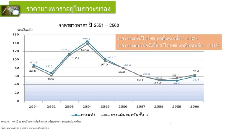 นายกฤษฎา บุญราช รัฐมนตรีว่าการกระทรวงเกษตรและสหกรณ์ เปิดเผยว่า ตามที่ได้มีการสนับสนุนให้ปลูกยางพาราในพื้นที่ต่าง ๆ ทั่วประเทศนับล้านไร่ มาตั้งแต่ปี 2547 เป็นต้นมา โดยไม่มีการวางแผนการผลิตให้สอดคล้องกับความต้องการของตลาดนั้น ได้ส่งผลให้ประเทศไทยเป็นทั้งผู้ผลิตยางพาราปริมาณมากที่สุดในโลก รวมทั้งเป็นผู้ส่งออกยางพารามากที่สุดในโลกด้วย แต่ปัจจุบันราคายางพาราในประเทศไทยและในตลาดโลกมีแนวโน้มลดลงเป็นระยะ ทำให้เกษตรกรชาวสวนยางส่วนใหญ่ประสบความเดือดร้อน จึงได้เรียกร้องให้รัฐบาลเข้ามาช่วยเหลือตามมาตรการต่าง ๆ เหมือนเช่นในอดีตที่ราคายางพาราตกต่ำ ซึ่งกระทรวงเกษตรและสหกรณ์ จึงได้ทำการศึกษาปัญหาภาวะวิกฤติราคายางพาราและแนวทางแก้ไขปัญหาราคายางพาราตกต่ำจากข้อมูลและข้อเท็จจริงจากพื้นที่ทั่วประเทศ รวมทั้งรวบรวมข้อมูลจากองค์การศึกษาเรื่องยางระหว่างประเทศ (IRSG) และหน่วยงานของรัฐ รวมทั้งสถาบันการศึกษาต่าง ๆ ได้พบข้อเท็จจริงที่สำคัญ สามารถสรุปได้ดังนี้ 1) ประเทศไทยมีพื้นที่กรีดยางมากที่สุดในกลุ่มประเทศผู้ผลิตรายใหญ่ คือ ไทย อินโดนีเซีย มาเลเซีย จีน เวียดนาม และอินเดีย โดยในปี 2560 ประเทศไทยมีพื้นที่กรีดยางได้ จำนวน 20.32 ล้านไร่ ทำให้ประเทศไทยมีผลผลิตยางมากที่สุดในโลกจำนวน 4.5 ล้านตัน เมื่อเทียบกับการผลิตยางธรรมชาติของทั้ง 6 ประเทศรายใหญ่ 2) ปัจจุบันราคายางพาราอยู่ในภาวะขาลง โดยราคายางแท่ง ปี 2551 - 2560 หดตัวลงเฉลี่ยร้อยละ 4.12 ราคายางแผ่นรมควันชั้น 3 ปี 2551 - 2560 หดตัวลงเฉลี่ยร้อยละ 2.86% 3) ต้นทุนการผลิตยางแผ่นดิบของประเทศไทย ปี 2550 – 2559 มีอัตราการเติบโตสูงขึ้นเป็นระยะ โดยไม่มีท่าทีว่าจะลดลงแต่อย่างใด โดยปัจจุบันมีต้นทุนการผลิตสูงขึ้นถึงร้อยละ 6.94