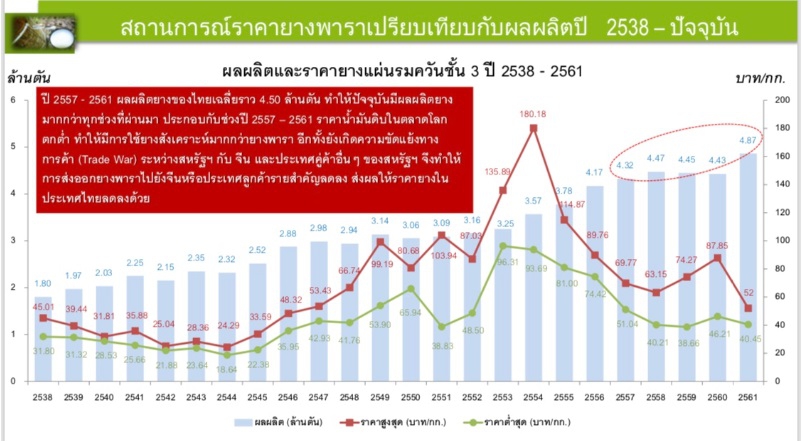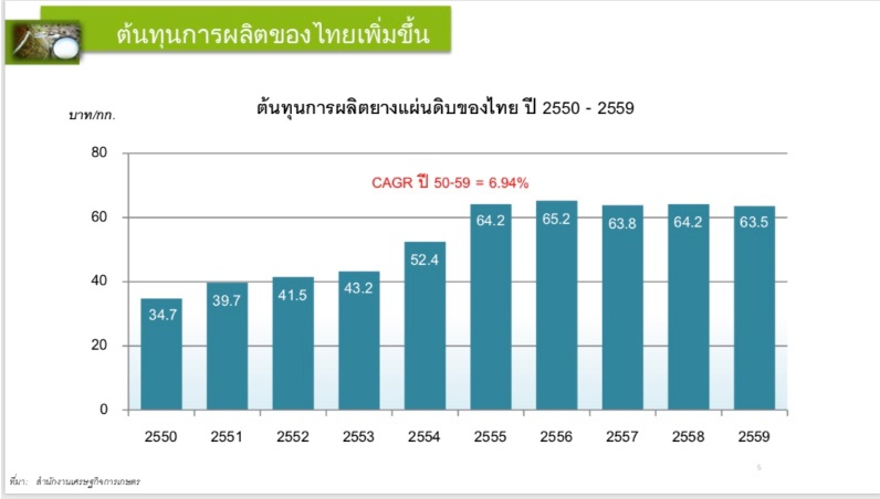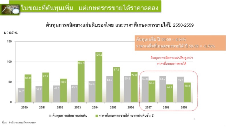 4) ในขณะที่ประเทศไทยมีต้นทุนการผลิตเพิ่มสูงขึ้น แต่เกษตรกรขายยางพาราได้ราคาลดลง ต้นทุนการผลิตยางแผ่นดิบของไทย และราคาที่เกษตรกรขายได้ปี 2550 - 2559 ต้นทุนเฉลี่ยเท่ากับร้อยละ 6.94 ราคาเฉลี่ยที่เกษตรกรขายได้เท่ากับติดลบร้อยละ 3.76 ซึ่งในปี 2557 - 2559 ต้นทุนการผลิตยางแผ่นดิบสูงกว่าราคาที่เกษตรกรขายได้ และ 5) สถานการณ์ราคายางพาราเปรียบเทียบกับผลผลิตทั้งประเทศ ตั้งแต่ปี 2540 – ปัจจุบัน จะเห็นว่าปี 2557 - 2561 ปริมาณผลผลิตยางเฉลี่ยในประเทศไทยมีแนวโน้มเพิ่มสูงขึ้นเป็นระยะ โดยปัจจุบันมีปริมาณผลผลิตยางมากที่สุดจำนวน 4.50 ล้านตัน ซึ่งมากกว่าทุกช่วงเวลาที่ผ่านมา ในขณะที่ราคายางพาราในตลาดโลกลดลงเรื่อย ๆ สวนทางกับปริมาณยางพาราที่สูงขึ้นนั้น ในช่วงปี 2557 – 2561 ราคาน้ำมันดิบในตลาดโลกก็มีราคาลดต่ำลงทำให้มีการใช้ยางสังเคราะห์มากกว่ายางพารา ขณะเดียวกันได้เกิดความขัดแย้งทางการค้า (Trade War) ระหว่างสหรัฐอเมริกากับจีน และประเทศคู่ค้าอื่น ๆ ของสหรัฐอเมริกา จึงทำให้การส่งออกยางพาราจากประเทศไทยไปยังประเทศจีนหรือประเทศลูกค้ารายสำคัญลดลง ส่งผลกระทบต่อราคายางในประเทศไทยลดลงด้วย