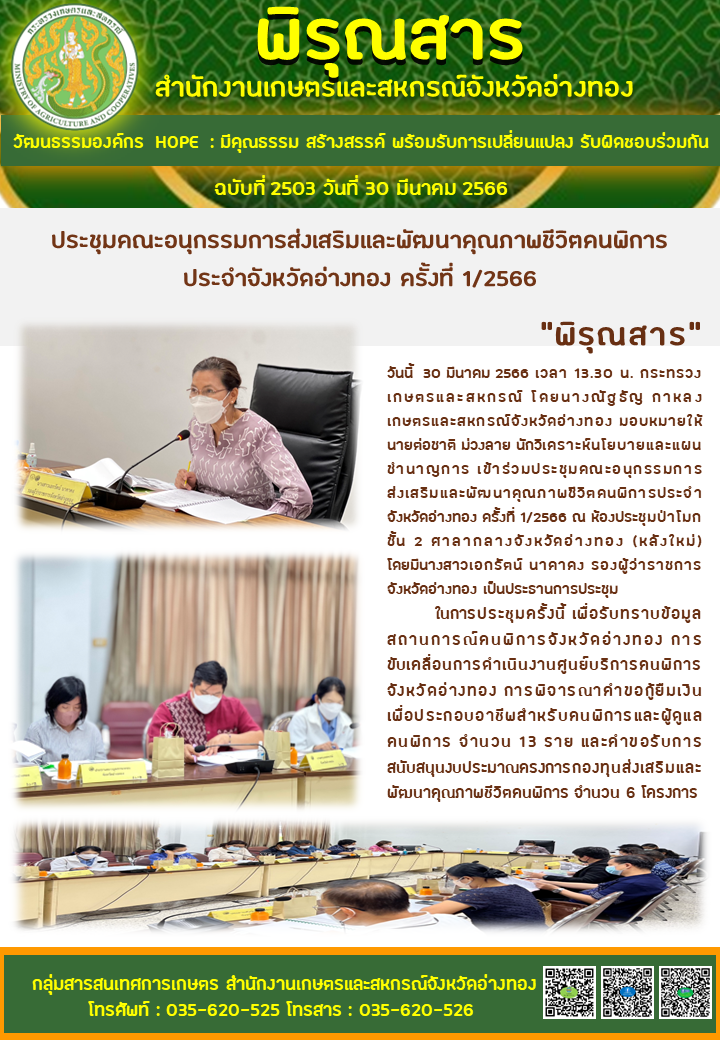 “พิรุณสาร” วันนี้ 30 มีนาคม 2566 เวลา 13.30 น. กระทรวงเกษตรและสหกรณ์ โดยนางณัฐธัญ กาหลง เกษตรและสหกรณ์จังหวัดอ่างทอง มอบหมายให้นายต่อชาติ ม่วงลาย นักวิเคราะห์นโยบายและแผนชำนาญการ เข้าร่วมประชุมคณะอนุกรรมการส่งเสริมและพัฒนาคุณภาพชีวิตคนพิการประจำจังหวัดอ่างทอง ครั้งที่ 1/2566 ณ ห้องประชุมป่าโมก ชั้น 2 ศาลากลางจังหวัดอ่างทอง (หลังใหม่) โดยมีนางสาวเอกรัตน์ นาคาคง รองผู้ว่าราชการจังหวัดอ่างทอง เป็นประธานการประชุม