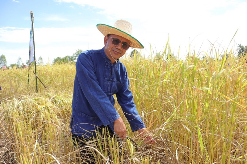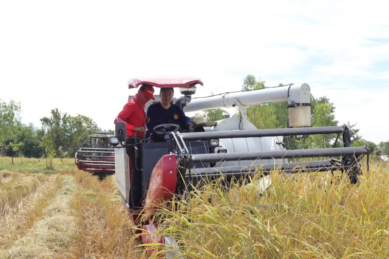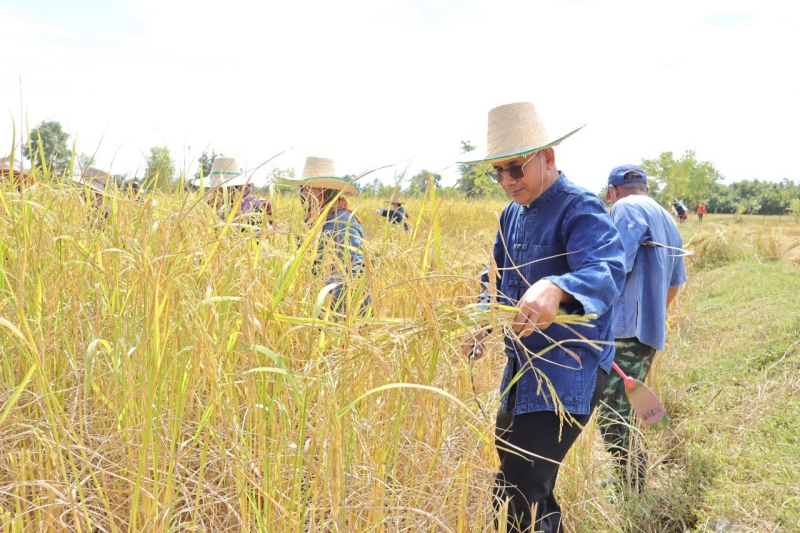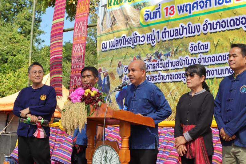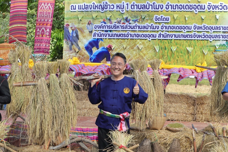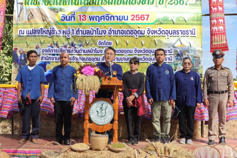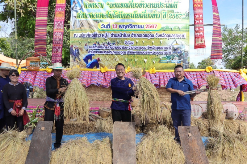 วันพุธที่ 13 พฤศจิกายน 2567 นายนาวิน ป้องกัน เกษตรและสหกรณ์จังหวัดอุบลราชธานี เข้าร่วมกิจกรรม "ลงแขกเกี่ยวข้าวตามประเพณี ถ่ายทอดเทคโลยีการเกี่ยวข้าว ปี 2567" โดยในงานมีกิจกรรม ลงแขกเกี่ยวข้าว วัดผลผลิตข้าว การนวดข้าว กิจกรรมลดการเผาในพื้นที่การเกษตร การอัดฟางข้าวเพื่อเก็บเป็นอาหารสัตว์ การหว่านเมล็ดปอเทืองเพื่อผลิตพืชปุ๋ยสดและการพ่นน้ำหมักด้วยโดรนเพื่อการเกษตร โดยมี ร้อยตรี สรมงคล มงคละสิริ เป็นประธานในพิธี ณ แปลงใหญ่ข้าว หมู่ 1 ตำบลป่าโมง อำเภอเดชอุดม จังหวัดอุบลราชธานี