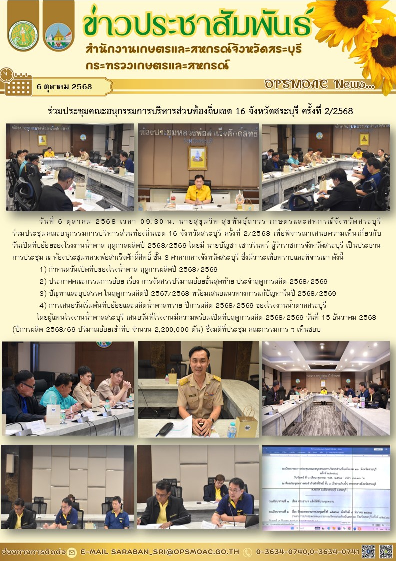 วันที่ 6 ตุลาคม 2568 เวลา 09.30 น. นายสุขุมวิท สุขพันธุ์ถาวร เกษตรและสหกรณ์จังหวัดสระบุรีร่วมประชุมคณะอนุกรรมการบริหารส่วนท้องถิ่นเขต 16 จังหวัดสระบุรี ครั้งที่ 2/2568 เพื่อพิจารณาเสนอความเห็นเกี่ยวกับ วันเปิดหีบอ้อยของโรงงานน้ำตาล ฤดูกาลผลิตปี 2568/2569 โดยมี นายบัญชา เชาวรินทร์ ผู้ว่าราชการจังหวัดสระบุรี เป็นประธาน การประชุม ณ ห้องประชุมหลวงพ่อสำเร็จศักดิ์สิทธิ์ ชั้น 3 ศาลากลางจังหวัดสระบุรี ซึ่งมีวาระเพื่อทราบและพิจารณา ดังนี้