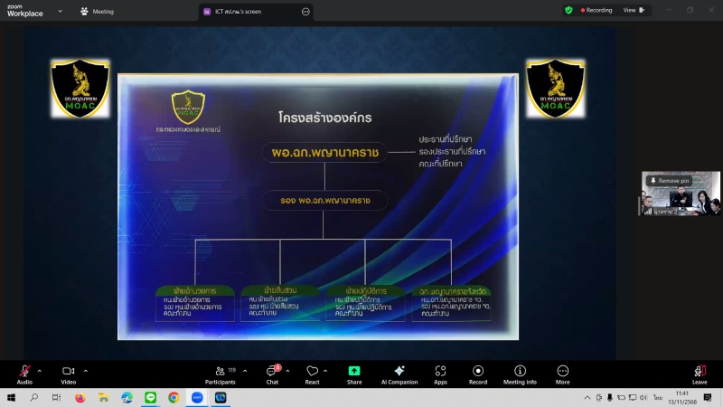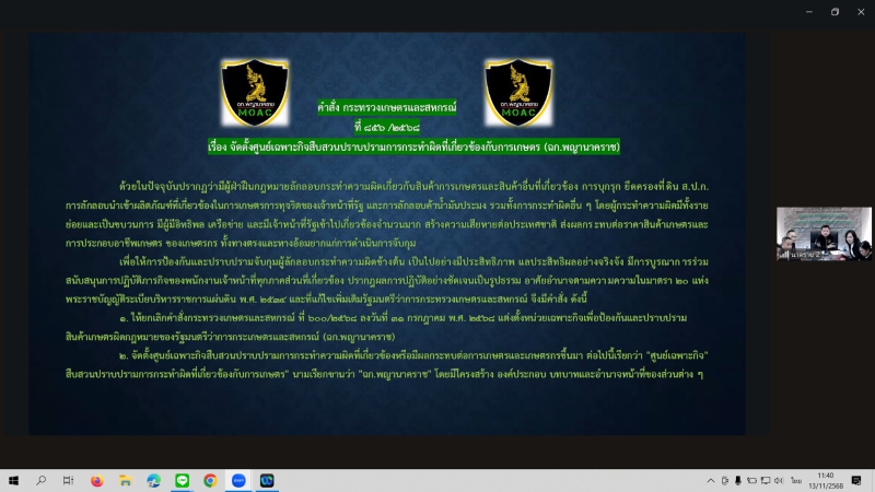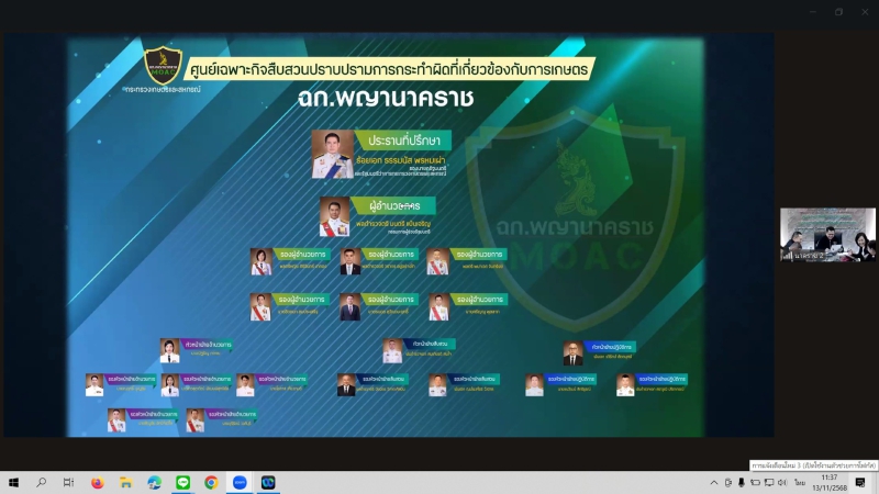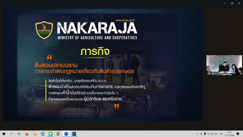 วันศุกร์ที่ 14 พฤศจิกายน 2568 เวลา 13.00 น. ที่ห้องประชุมสำนักงานเกษตรและสหกรณ์จังหวัดอำนาจเจริญ นางปารีณา สอนอาจ เกษตรและสหกรณ์จังหวัดอำนาจเจริญ พร้อมด้วยข้าราชการและเจ้าหน้าที่สำนักงาน เข้าร่วมประชุมชี้แจงแนวทางการปฏิบัติของศูนย์เฉพาะกิจสืบสวนปราบปรามการกระทำผิดที่เกี่ยวข้องกับการเกษตร (ฉก.พญานาคราช) ผ่านระบบประชุมทางไกล Zoom Meeting โดยมีนายนายศรัญญู พูลลาภ ผู้ตรวจราชการกระทรวงเกษตรและสหกรณ์ เป็นประธานในการประชุม