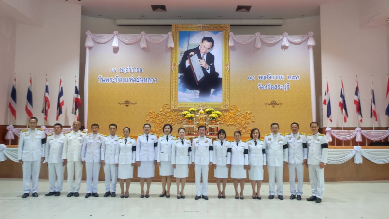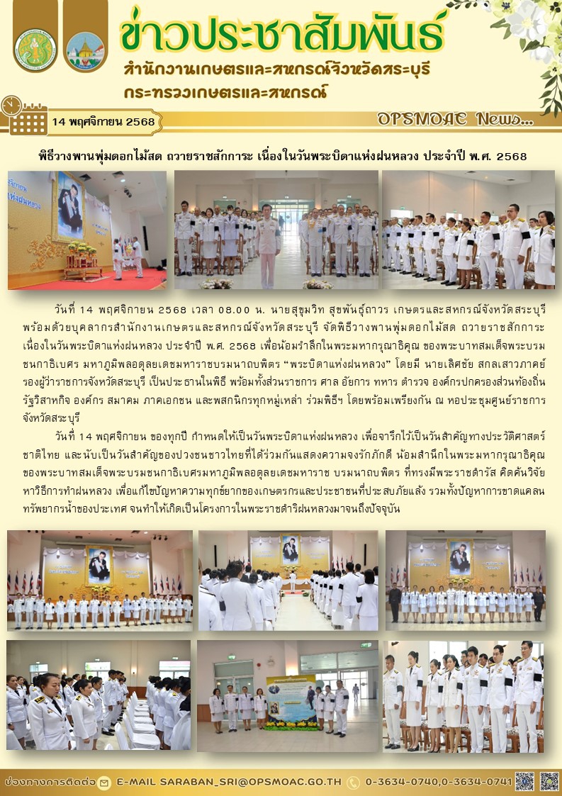วันที่ 14 พฤศจิกายน 2568 เวลา 08.00 น. นายสุขุมวิท สุขพันธุ์ถาวร เกษตรและสหกรณ์จังหวัดสระบุรี พร้อมด้วยบุคลากรสํานักงานเกษตรและสหกรณ์จังหวัดสระบุรี จัดพิธีวางพานพุ่มดอกไม้สด ถวายราชสักการะ เนื่องในวันพระบิดาแห่งฝนหลวง ประจำปี พ.ศ. 2568 เพื่อน้อมรำลึกในพระมหากรุณาธิคุณ ของพระบาทสมเด็จพระบรมชนกาธิเบศร มหาภูมิพลอดุลยเดชมหาราชบรมนาถบพิตร “พระบิดาแห่งฝนหลวง” โดยมี นายเลิศชัย สกลเสาวภาคย์ รองผู้ว่าราชการจังหวัดสระบุรี เป็นประธานในพิธี พร้อมทั้งส่วนราชการ ศาล อัยการ ทหาร ตํารวจ องค์กรปกครองส่วนท้องถิ่น รัฐวิสาหกิจ องค์กร สมาคม ภาคเอกชน และพสกนิกรทุกหมู่เหล่า ร่วมพิธีฯ โดยพร้อมเพรียงกัน ณ หอประชุมศูนย์ราชการจังหวัดสระบุรี