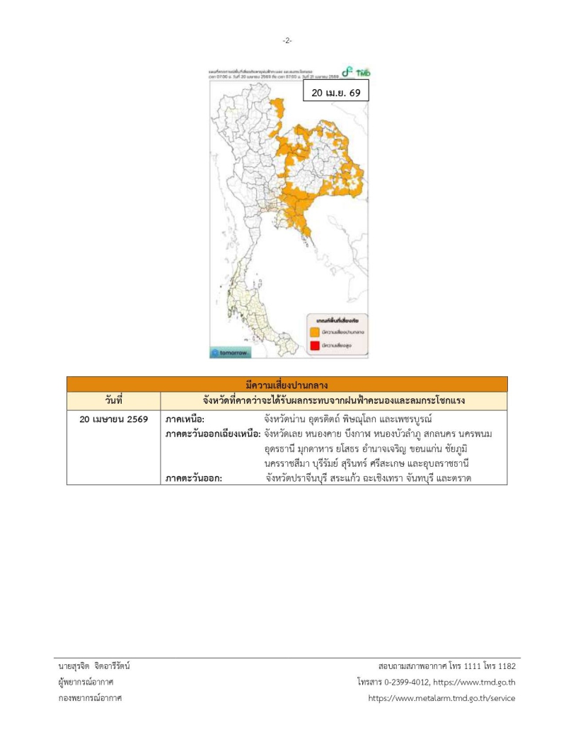 พยากรณ์อากาศ 24 ชั่วโมงข้างหน้า (20 เม.ย. 69) :