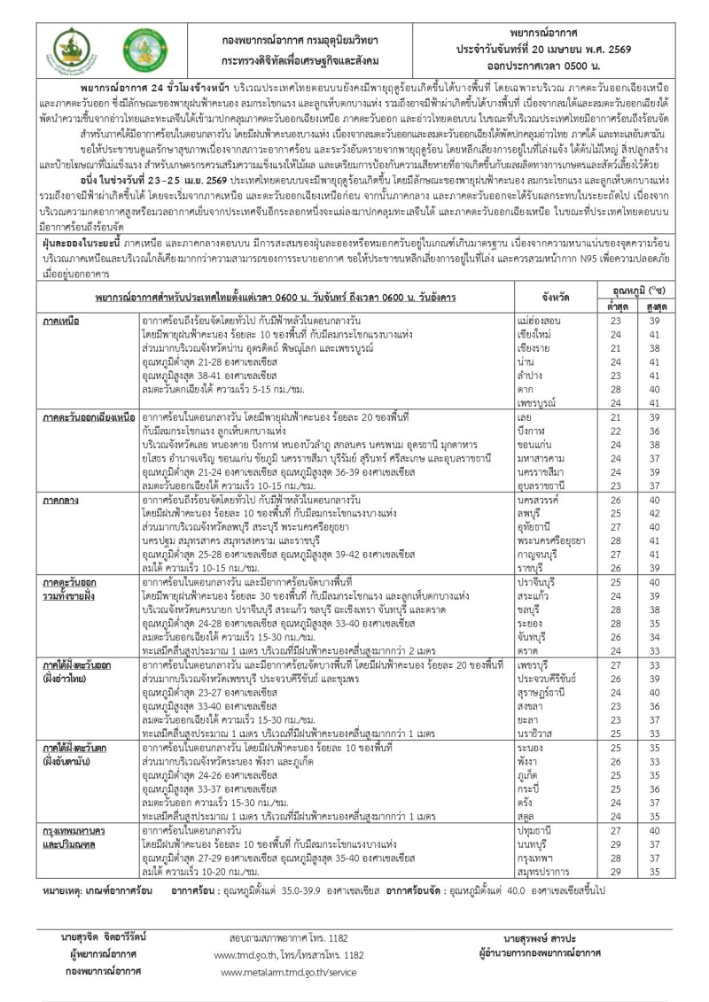 พยากรณ์อากาศรายภาคพร้อมแผนที่พื้นที่คาดการณ์ความเสี่ยงในการเกิดภัย ประจำวันที่ 20 เมษายน 2569 เวลา 05.00 น.