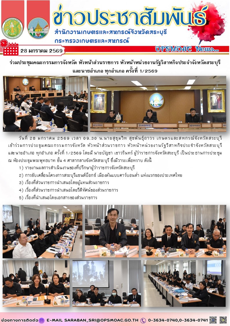 วันที่ 28 มกราคม 2569 เวลา 09.30 น.นายสุขุมวิท สุขพันธุ์ถาวร เกษตรและสหกรณ์จังหวัดสระบุรี เข้าร่วมการประชุมคณะกรรมการจังหวัด หัวหน้าส่วนราชการ หัวหน้าหน่วยงานรัฐวิสาหกิจประจำจังหวัดสระบุรีและนายอำเภอ ทุกอำเภอ ครั้งที่ 1/2569 โดยมี นายบัญชา เชาวรินทร์ ผู้ว่าราชการจังหวัดสระบุรี เป็นประธานการประชุม ณ ห้องประชุมพระพุทธบาท ชั้น 4 ศาลากลางจังหวัดสระบุรี ซึ่งมีวาระเพื่อทราบ ดังนี้