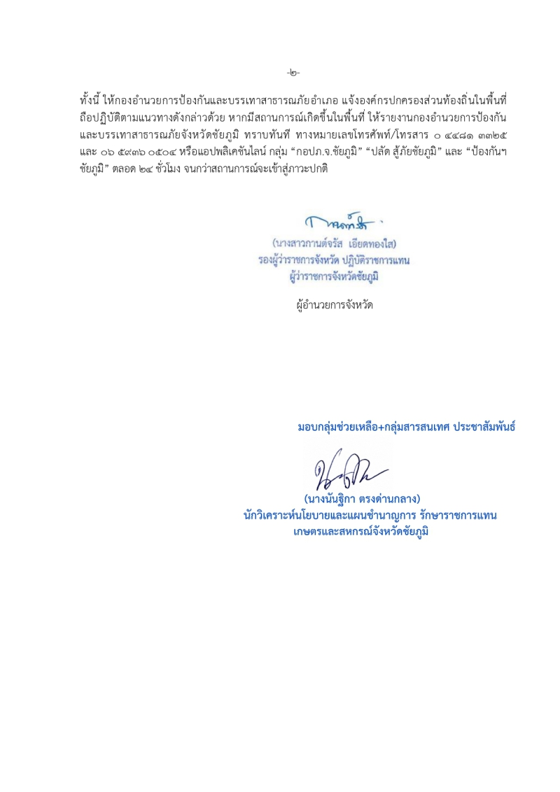 กองอำนวยการป้องกันและบรรเทาสาธารณภัยกลาง (กอปภ.ก.) ได้ติดตามสภาวะอากาศและพิจารณาปัจจัยเสี่ยง กอปรกับกรมอุตุนิยมวิทยาได้มีประกาศเรื่องพายุฤดูร้อนบริเวณประเทศไทยตอนบน (มีผลกระทบ ในช่วงวันที่ ๒๓ - ๒๕ กุมภาพันธ์ ๒๕๖๙) ฉบับที่ ๑ (๑/๒๕๖๙) ประกาศ ณ วันที่ ๒๐ กุมภาพันธ์ ๒๕๖๙เวลา ๑๑.๐๐ น. แจ้งว่า บริเวณความกดอากาศสูงหรือมวลอากาศเย็นจากสาธารณรัฐประชาชนจีนเคลื่อนเข้าปกคลุมภาคตะวันออกเฉียงเหนือและทะเลจีนใต้ ส่งผลทําให้มีลมใต้และลมตะวันออกเฉียงใต้พัดปกคลุมภาคตะวันออกเฉียงเหนือ ภาคกลาง ภาคตะวันออก และอ่าวไทย ประกอบกับมีคลื่นกระแสลมฝ่ายตะวันตกเคลื่อนผ่านภาคเหนือและภาคตะวันออกเฉียงเหนือ ในขณะที่ประเทศไทยตอนบนมีอากาศร้อนถึงร้อนจัดทําให้บริเวณภาคเหนือ ภาคตะวันออกเฉียงเหนือ ภาคกลาง รวมทั้งกรุงเทพมหานครและปริมณฑล จะมีพายุฤดูร้อนเกิดขึ้นบางพื้นที่ โดยจะมีพายุฝนฟ้าคะนอง ลมกระโชกแรง ลูกเห็บตก และฝนตกหนักบางพื้นที่รวมถึงฟ้าผ่าที่อาจเกิดขึ้นได้ โดยจังหวัดชัยภูมิเป็นพื้นที่เฝ้าระวังสถานการณ์พายุฝนฟ้าคะนองและลมกระโชกแรงระหว่างวันที่ ๒๓ - ๒๕ กุมภาพันธ์ ๒๕๖๙