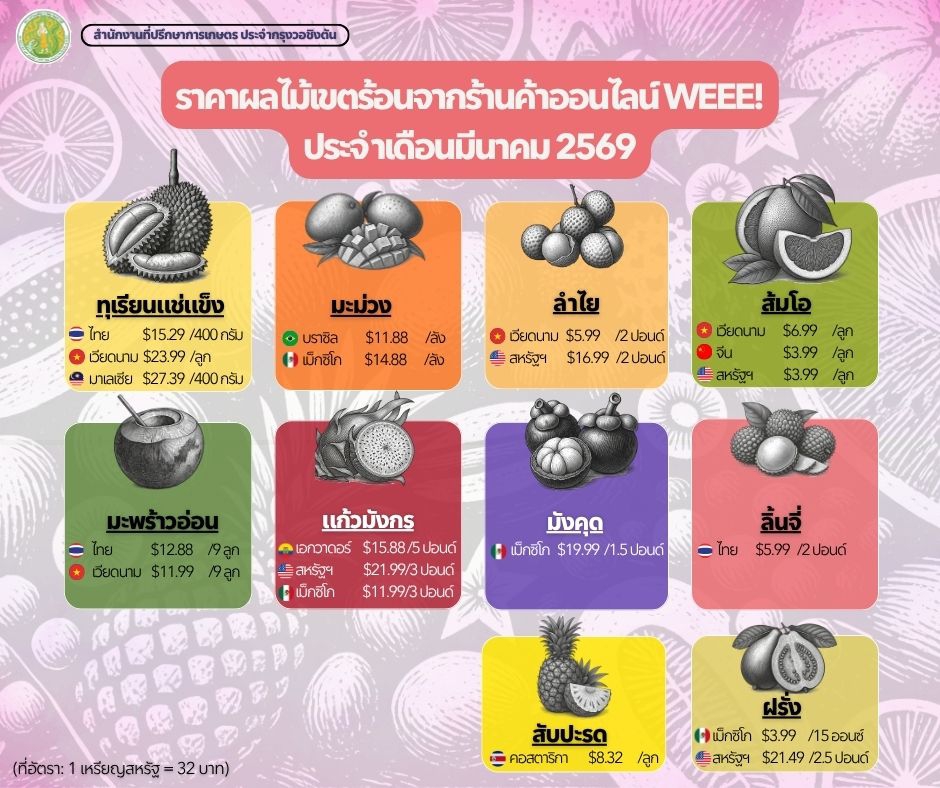 - ราคาทุเรียน (แช่แข็ง) ไทย $2.99/ปอนด์ มาเลเซีย $9.99/ปอนด์ และเวียดนาม $2.98/ปอนด์