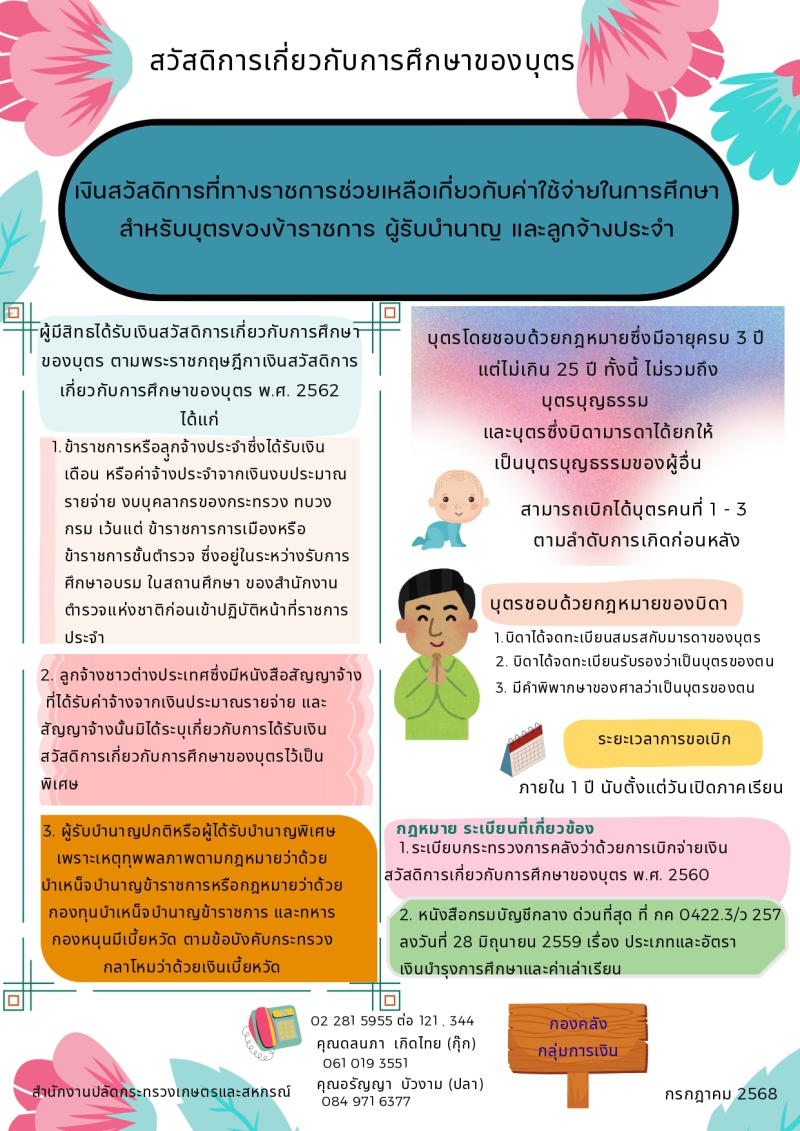 สิทธิประโยชน์ดี ๆ สำหรับข้าราชการ ผู้รับบำนาญ และลูกจ้างประจำ สวัสดิการการศึกษาบุตร & เตรียมความพร้อมก่อนเกษียณเพื่อส่งเสริมคุณภาพชีวิตของข้าราชการและครอบครัว กองคลังขอประชาสัมพันธ์ 2 สิทธิประโยชน์สำคัญ ที่ไม่ควรพลาด