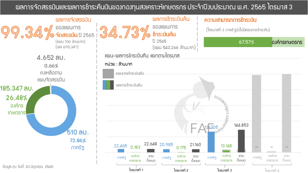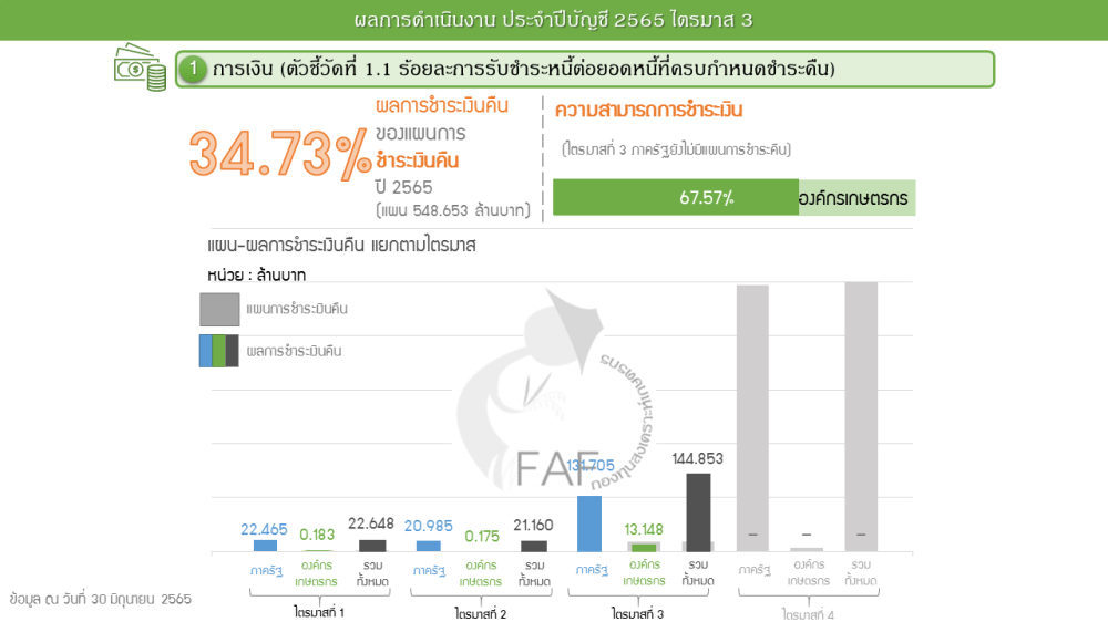 ผลการชำระเงินคืนกองทุนสงเคราะห์เกษตรกร ไตรมาส 3 ประจำปีงบประมาณ พ.ศ. 2565