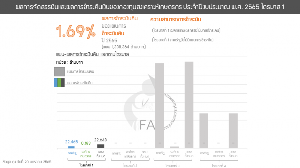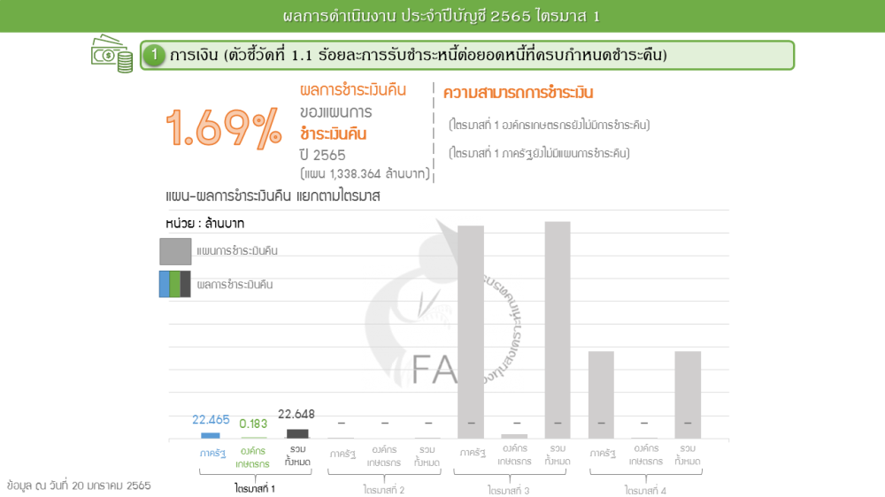 ผลการชำระเงินคืนกองทุนสงเคราะห์เกษตรกร ไตรมาส 1 ประจำปีงบประมาณ พ.ศ. 2565