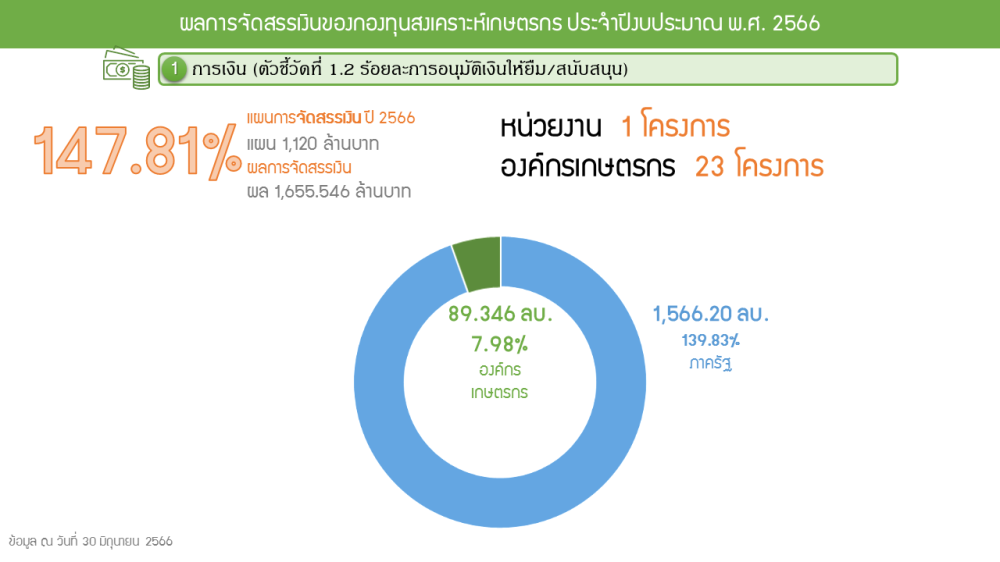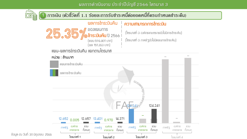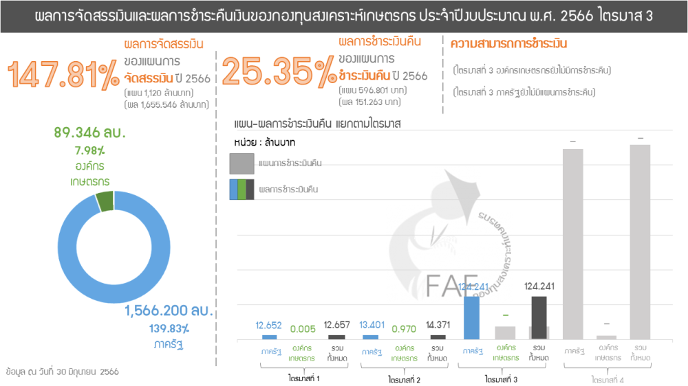 ผลการชำระเงินคืนกองทุนสงเคราะห์เกษตรกร ไตรมาส 3 ประจำปีงบประมาณ พ.ศ. 2566
