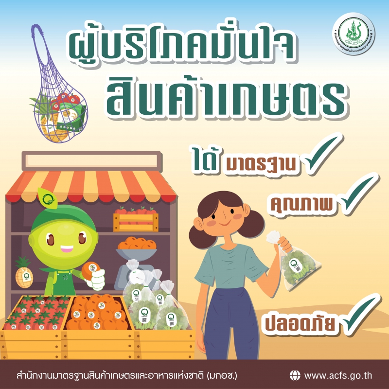 อันนี้มั่นใจได้ว่าปลอดภัยได้คุณภาพ หรือหากสั่งซื้อสินค้าจากตลาดสด หรือห้าง Modern Trade ตัวสินค้าอาจจะไม่ได้ติดเครื่องหมาย แต่ว่าหรือห้าง ตลาด นั้นได้การรับรองว่าเป็นแหล่งที่ขายสินค้าเกษตรที่ปลอดภัย ก็มั่นใจได้ในระดับหนึ่งเช่นกัน หรือหากเลือกไปนั่งรับประทานอาหารในร้านอาหาร หากมีป้าย Q Restaurant ท่านก็จะมั่นใจว่าร้านนั้นใช้วัตถุดิบที่ได้มาตรฐานและปลอดภัย หรือหากจะซื้อสินค้าเกษตรออนไลน์ก็สามารถเข้าไปดูในแพลตฟอร์มออนไลน์ต่างๆ โดยเฉพาะที่ทาง มกอช. พัฒนาขึ้นมา เรียกว่า DGT FARM ที่นำเอาสินค้าเกษตรที่ผ่านการรับรองมาตรฐานเข้ามาจำหน่าย ถ้าท่านเลือกซื้อสินค้าจากแพลตฟอร์มนี้ก็จะเป็นสินค้าเกษตรที่ได้มาตรฐานทั้งหมด"