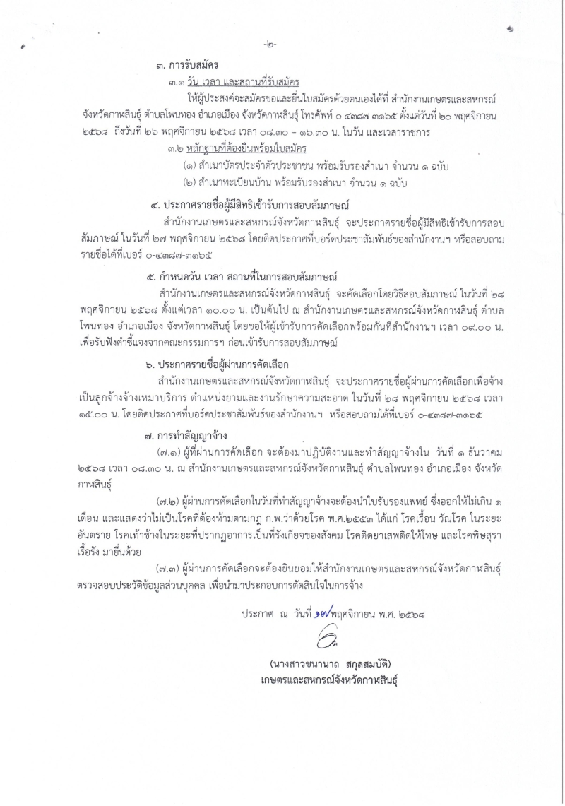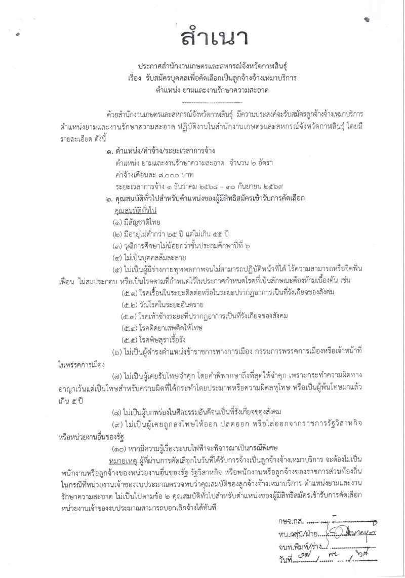 ประกาศสำนักงานเกษตรและสหกรณ์จังหวัดกาฬสินธุ์ เรื่อง รับสมัครบุคคลเพื่อคัดเลือกเป็นลูกจ้างจ้างเหมาบริการ ตำแหน่ง ยามและงานรักษาความสะอาด