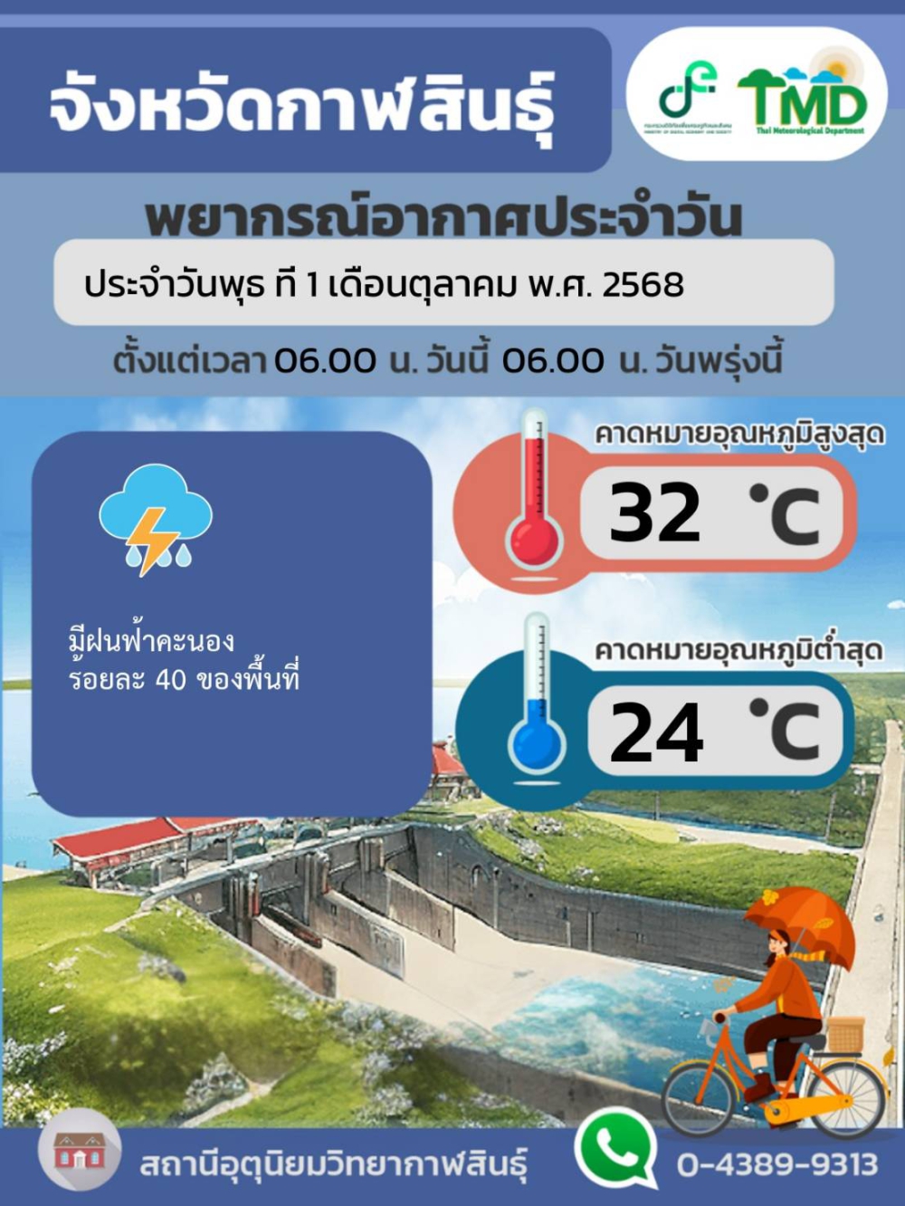 พยากรณ์อากาศจังหวัดกาฬสินธุ์ 1 ตุลาคม 2568