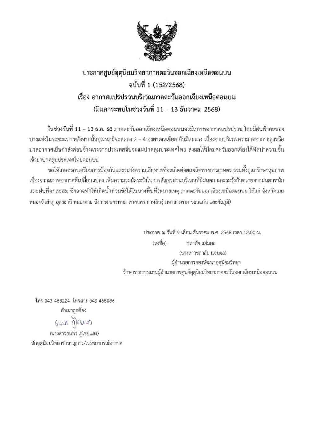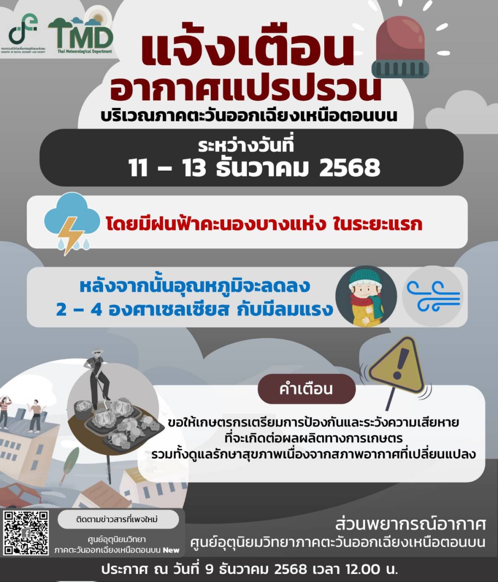 ประกาศศูนย์อุตุนิยมวิทยาภาคตะวันออกเฉียงเหนือตอนบน ฉบับที่ 1 เรื่อง อากาศแปรปรวนบริเวณภาคตะวันออกเฉียงเหนือตอนบน