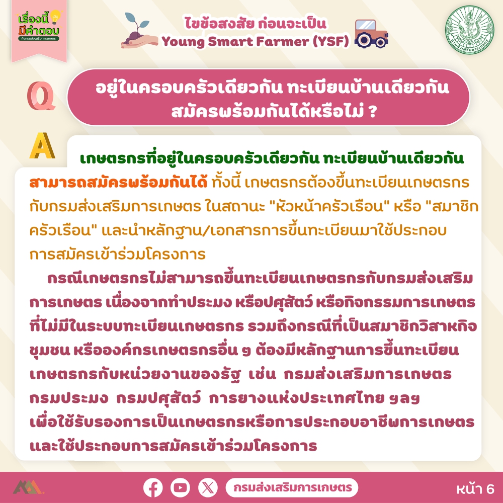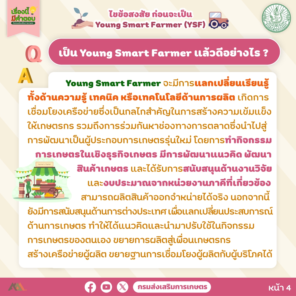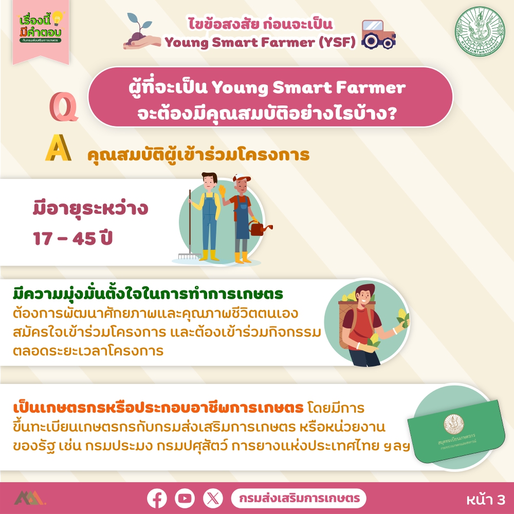 ช่วงเวลาสำคัญของ Young Smart Farmer เกษตรกรรุ่นใหม่ที่รักและอยากพัฒนาอาชีพด้านการเกษตรมาถึงแล้ว เราจะได้มาร่วมแลกเปลี่ยนทั้งด้านความรู้ เทคโนโลยีด้านการผลิต การหาช่องทางการตลาด เพื่อก้าวสู่การพัฒนาเป็นผู้ประกอบการเกษตรรุ่นใหม่ แต่ท่านรู้หรือไม่...ก่อนจะได้เป็น Young Smart Farmer (YSF) จะต้องทำอย่างไร มีอะไรที่จะต้องรู้ก่อนสมัครบ้าง เรารวบรวมคำถามมาไว้ให้ที่นี่แล้ว
