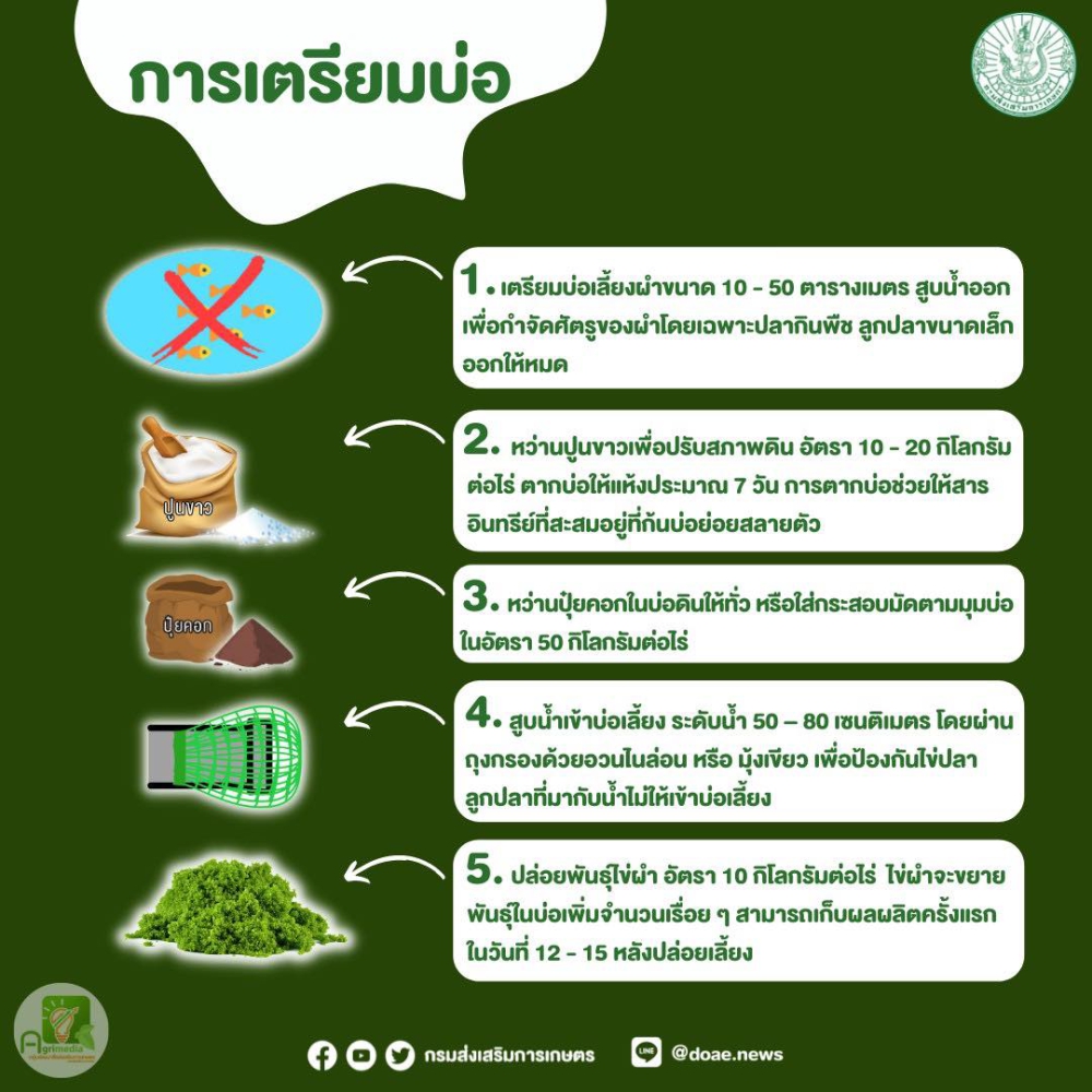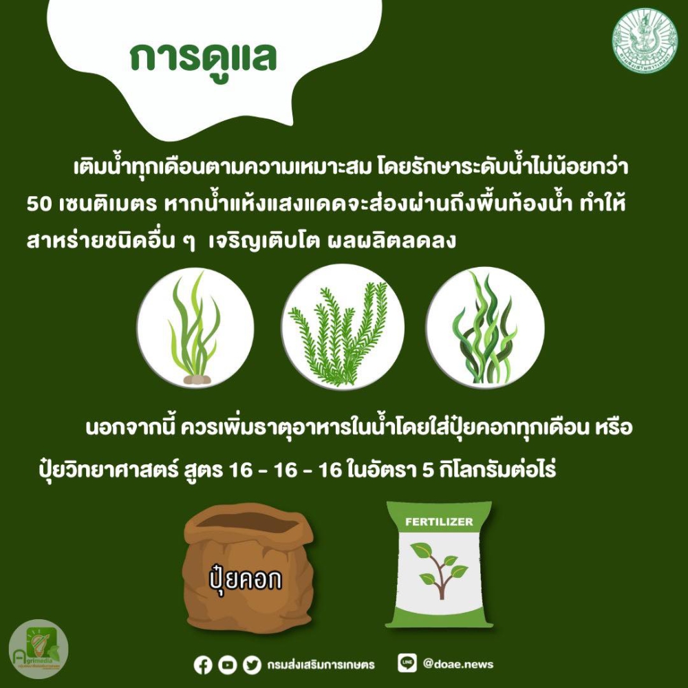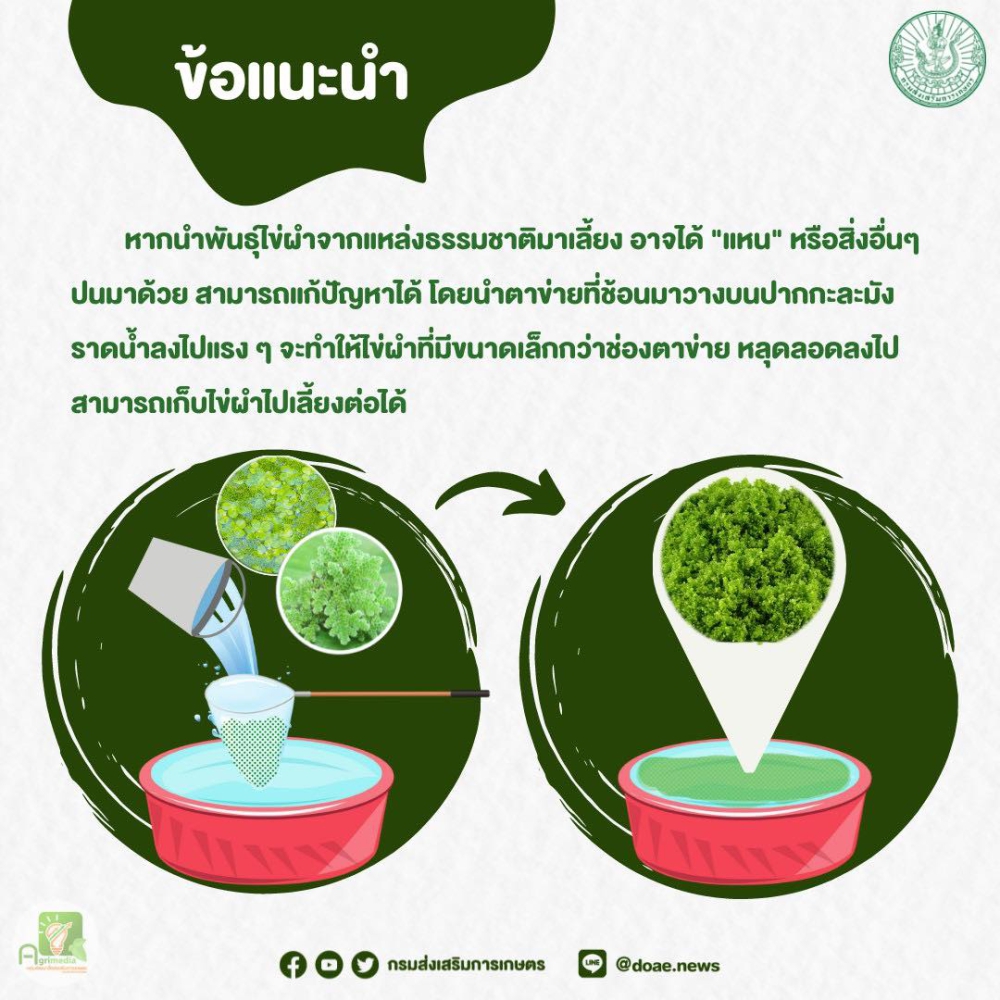 5. ปล่อยไข่น้ำ อัตรา 10 กิโลกรัมต่อไร่ ไข่น้ำจะเริ่มแตกหน่อขยายพันธุ์ในบ่อเพิ่มจำนวนเรื่อย ๆ สามารถเก็บผลผลิตครั้งแรกในวันที่ 12-15 หลังปล่อยเลี้ยง และสามารถเก็บได้ทุก 6 วัน ทั้งนี้การเก็บผลผลิตแต่ละครั้งควรเก็บอัตราไม่เกิน 50% ของพื้นที่เพื่อให้มีมีพันธุ์ไข่น้ำขยายพันธุ์ต่อไป