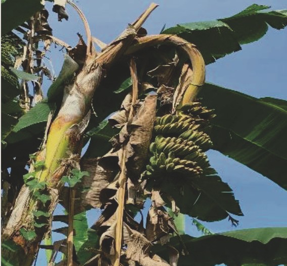 อาการที่เครือ ปลีกล้วยแคระแกร็น และหากติดผล ผลจะลีบ เนื้อภายในมีสีน้ำตาลจนถึงดำ บางผลมีอาการฉ่ำน้ำและเน่าเละ ปลายผลมีสีเหลืองต่อมาเปลี่ยนเป็นสีดำ หากอาการรุนแรงมาก จะทำให้ไม่ได้ผลผลิต