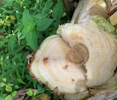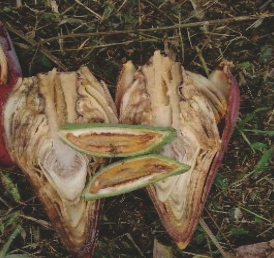 อาการที่ลำต้นเทียม เมื่อตัดลำต้นดูจะเห็นท่อน้ำท่ออาหารเปลี่ยนเป็นสีน้ำตาล
