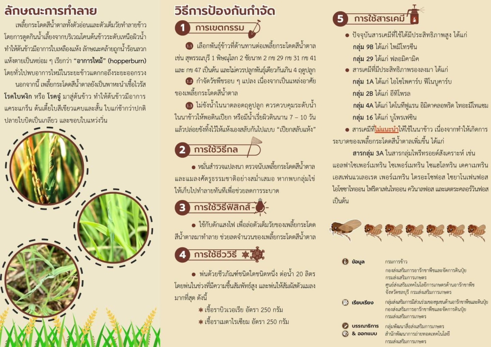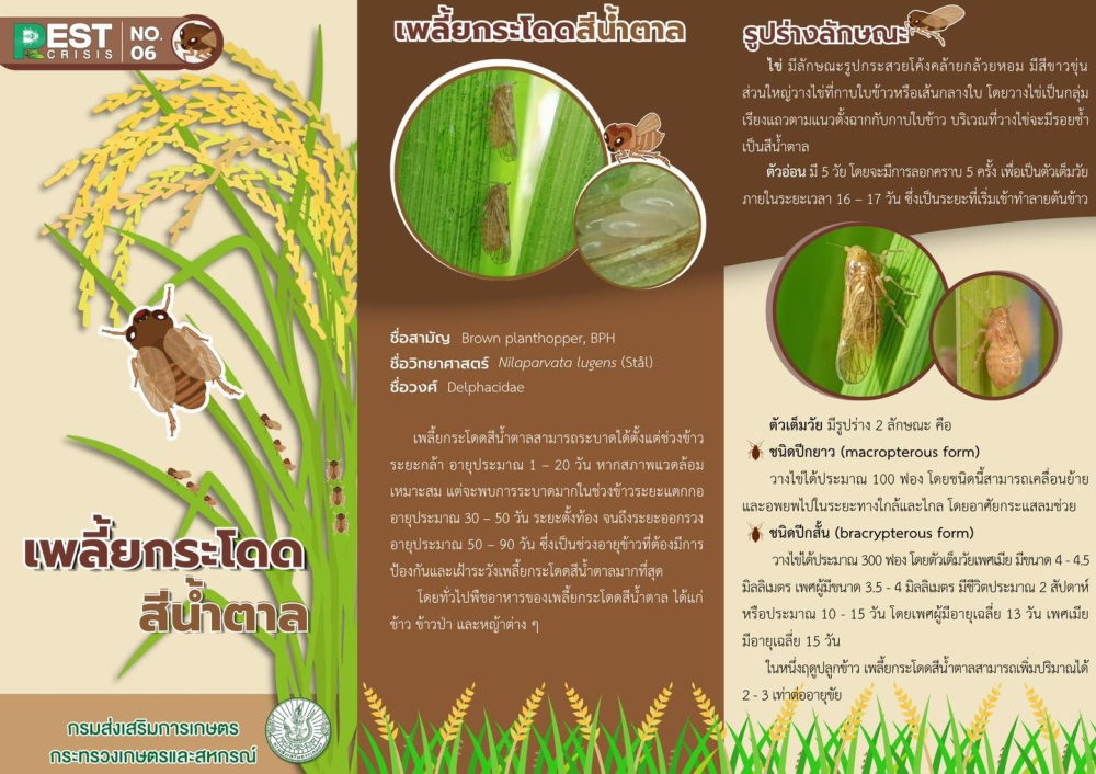 เพลี้ยกระโดดสีน้ำตาลสามารถระบาดได้ตั้งแต่ช่วงข้าวระยะกล้าอายุประมาณ 1 – 20 วัน หากสภาพแวดล้อมเหมาะสม แต่จะพบการระบาดมากในช่วงข้าวระยะแตกกอ อายุประมาณ 30 – 50 วัน ระยะตั้งท้อง จนถึงระยะออกรวง อายุประมาณ 50 – 90 วัน ซึ่งเป็นช่วงอายุข้าวที่ต้องมีการป้องกันและเฝ้าระวังเพลี้ยกระโดดสีน้ำตาลมากที่สุด ข้อมูล: กองส่งเสริมการอารักขาพืชและจัดการดินปุ๋ย กรมส่งเสริมการเกษตร