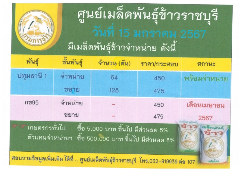 ประชาสัมพันธ์การจำหน่ายเมล็ดพันธุ์ข้าว ประจำเดือน มกราคม 2567 ของศูนย์เมล็ดพันธุ์ข้าวราชบุรี กรมการข้าว