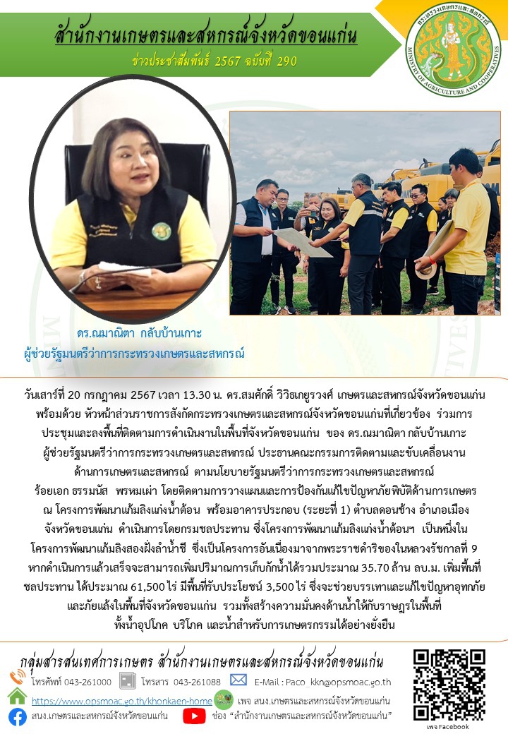 วันเสาร์ที่ 20 กรกฎาคม 2567 เวลา 13.30 น. ดร.สมศักดิ์ วิวิธเกยูรวงศ์ เกษตรและสหกรณ์จังหวัดขอนแก่น พร้อมด้วย หัวหน้าส่วนราชการสังกัดกระทรวงเกษตรและสหกรณ์จังหวัดขอนแก่นที่เกี่ยวข้อง ร่วมการประชุมและลงพื้นที่ติดตามการดำเนินงานในพื้นที่จังหวัดขอนแก่น ของ ดร.ณมาณิตา กลับบ้านเกาะ ผู้ช่วยรัฐมนตรีว่าการกระทรวงเกษตรและสหกรณ์ ประธานคณะกรรมการติดตามและขับเคลื่อนงานด้านการเกษตรและสหกรณ์ ตามนโยบายรัฐมนตรีว่าการกระทรวงเกษตรและสหกรณ์ ร้อยเอก ธรรมนัส พรหมเผ่า โดยติดตามการวางแผนและการป้องกันแก้ไขปัญหาภัยพิบัติด้านการเกษตร ณ โครงการพัฒนาแก้มลิงแก่งน้ำต้อน พร้อมอาคารประกอบ (ระยะที่ 1) ตำบลดอนช้าง อำเภอเมือง จังหวัดขอนแก่น ดำเนินการโดยกรมชลประทาน ซึ่งโครงการพัฒนาแก้มลิงแก่งน้ำต้อนฯ เป็นหนึ่งในโครงการพัฒนาแก้มลิงสองฝั่งลำน้ำชี ซึ่งเป็นโครงการอันเนื่องมาจากพระราชดำริของในหลวงรัชกาลที่ 9 หากดำเนินการแล้วเสร็จจะสามารถเพิ่มปริมาณการเก็บกักน้ำได้รวมประมาณ 35.70 ล้าน ลบ.ม. เพิ่มพื้นที่ชลประทาน ได้ประมาณ 61,500 ไร่ มีพื้นที่รับประโยชน์ 3,500 ไร่ ซึ่งจะช่วยบรรเทาและแก้ไขปัญหาอุทกภัยและภัยแล้งในพื้นที่จังหวัดขอนแก่น รวมทั้งสร้างความมั่นคงด้านน้ำให้กับราษฎรในพื้นที่ ทั้งน้ำอุปโภค บริโภค และน้ำสำหรับการเกษตรกรรมได้อย่างยั่งยืน
