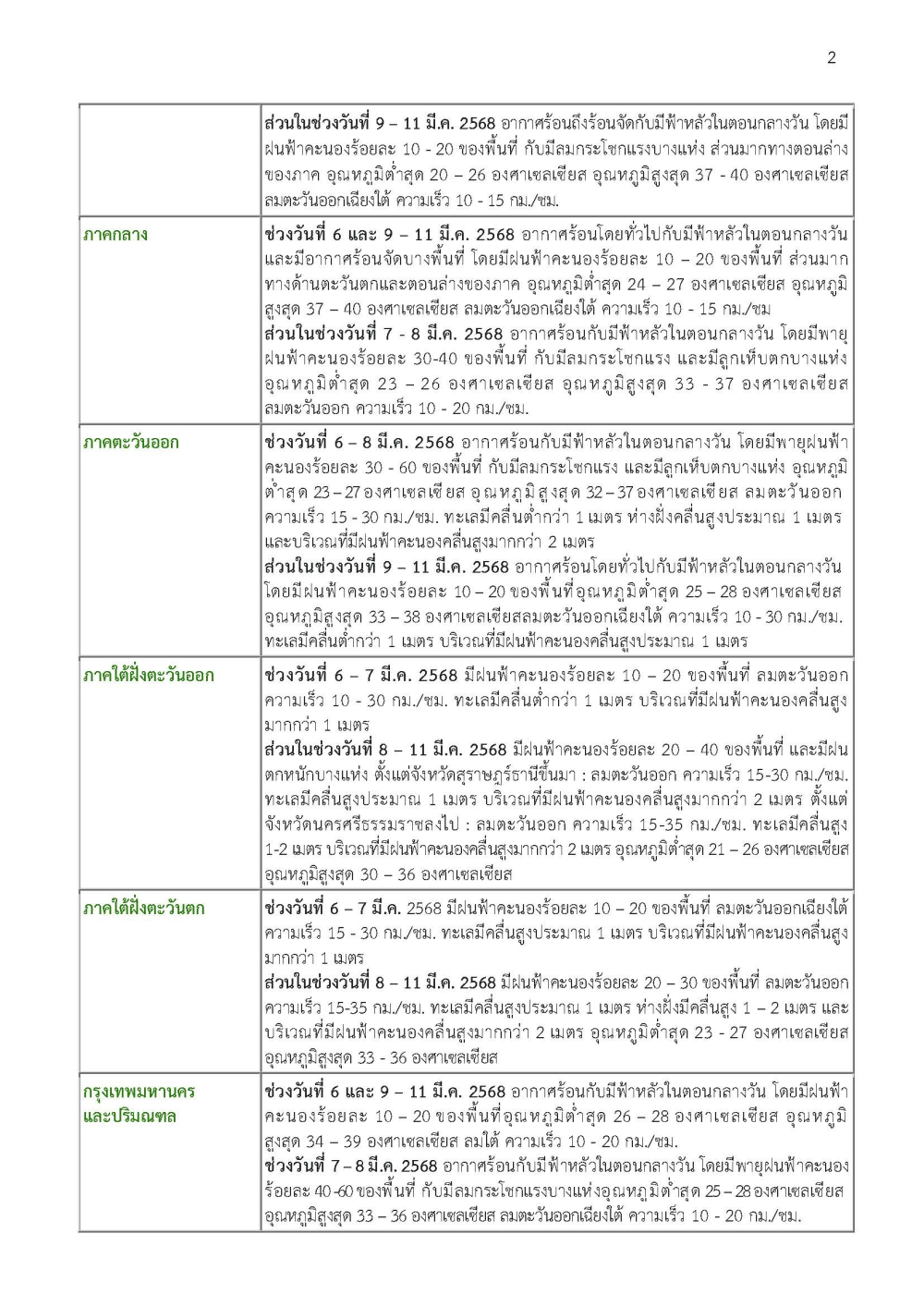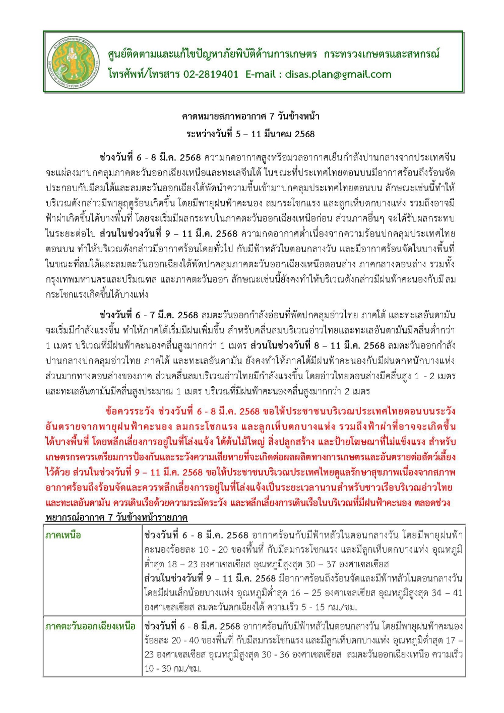 คาดหมายสภาพอากาศ 7 วันข้างหน้า ระหว่างวันที่ 5 – 11 มีนาคม 2568