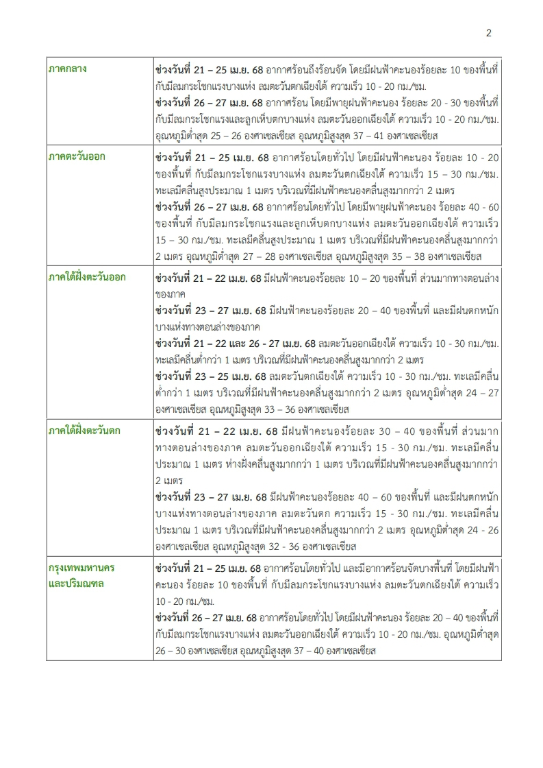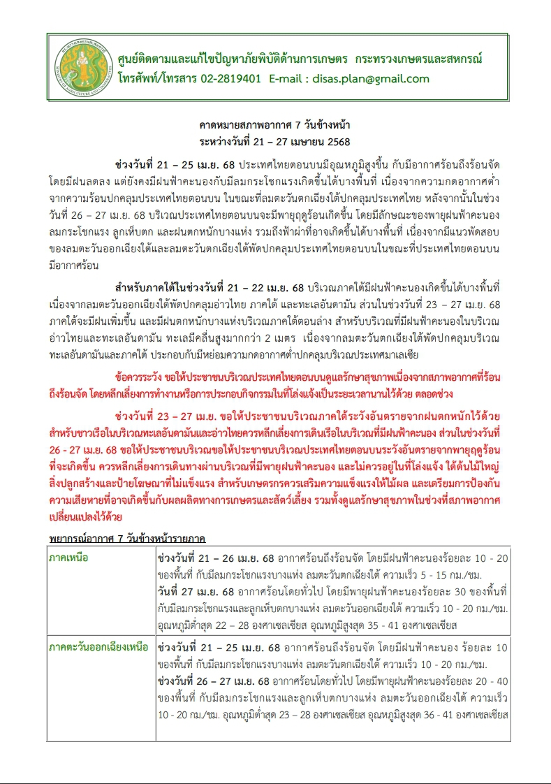คาดหมายสภาพอากาศ 7 วันข้างหน้า ระหว่างวันที่ 21 – 27 เมษายน 2568