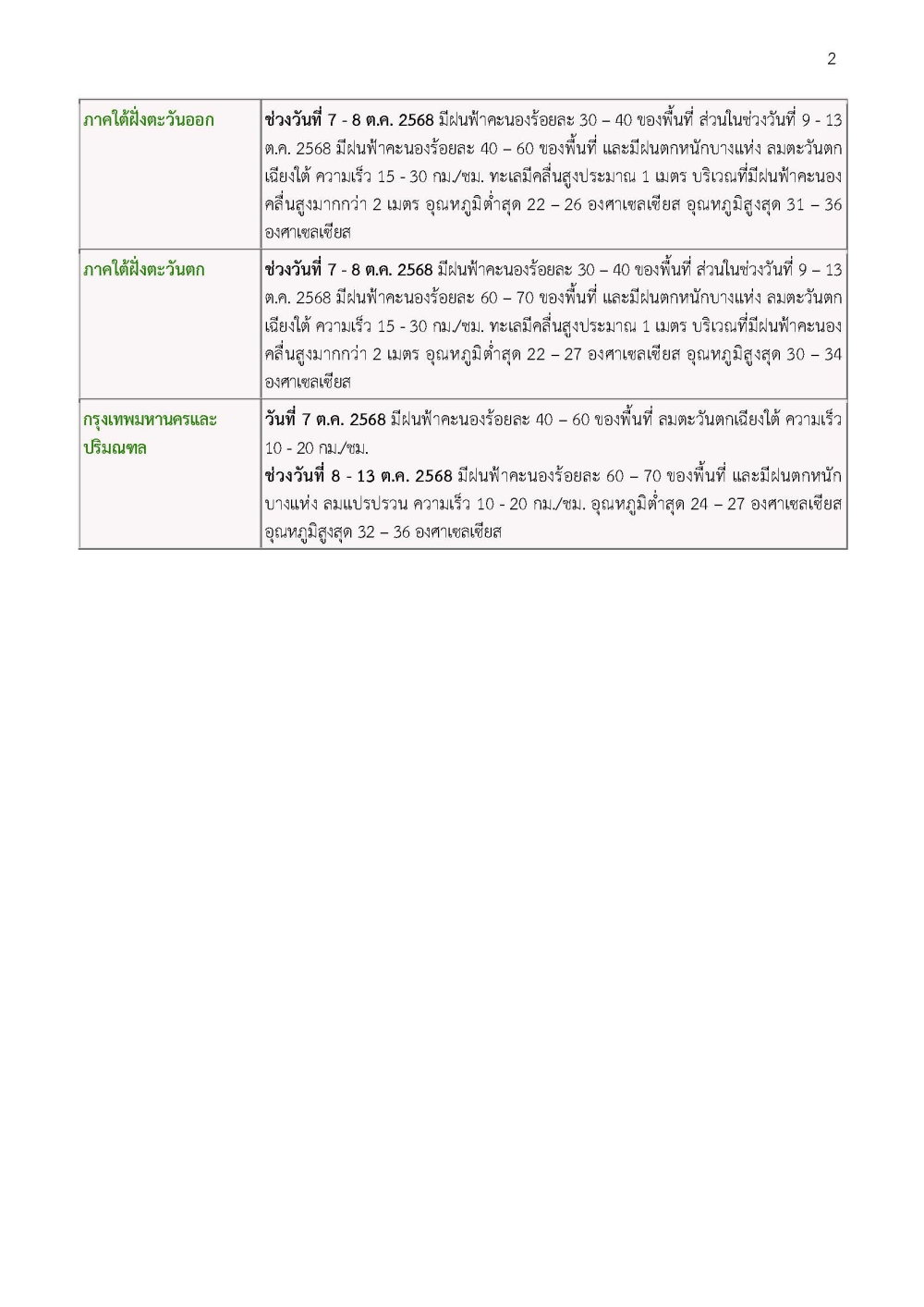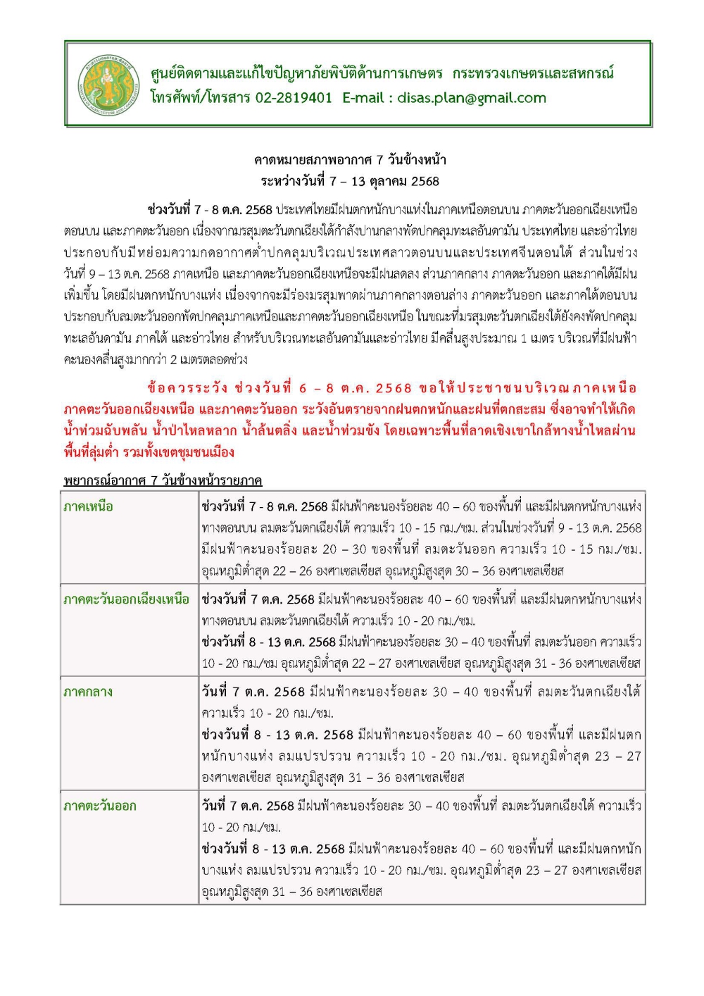 คาดหมายสภาพอากาศ 7 วันข้างหน้า ระหว่างวันที่ 7 – 13 ตุลาคม 2568