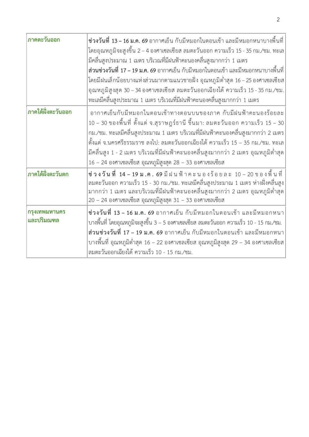 คาดหมายสภาพอากาศ 7 วันข้างหน้า ระหว่างวันที่ 13 มกราคม – 19 มกราคม 2569