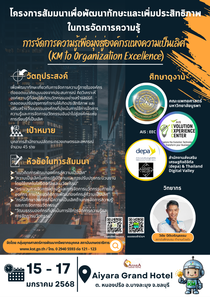 โครงการสัมมนาเพื่อพัฒนาทักษะและเพิ่มประสิทธิภาพในการจัดการความรู้: การจัดการความรู้เพื่อมุ่งสู่องค์กรแห่งความเป็นเลิศ (KM to Organization Excellence) ระหว่างวันที่ 15 – 17 มกราคม 2568 ณ จังหวัดชลบุรี