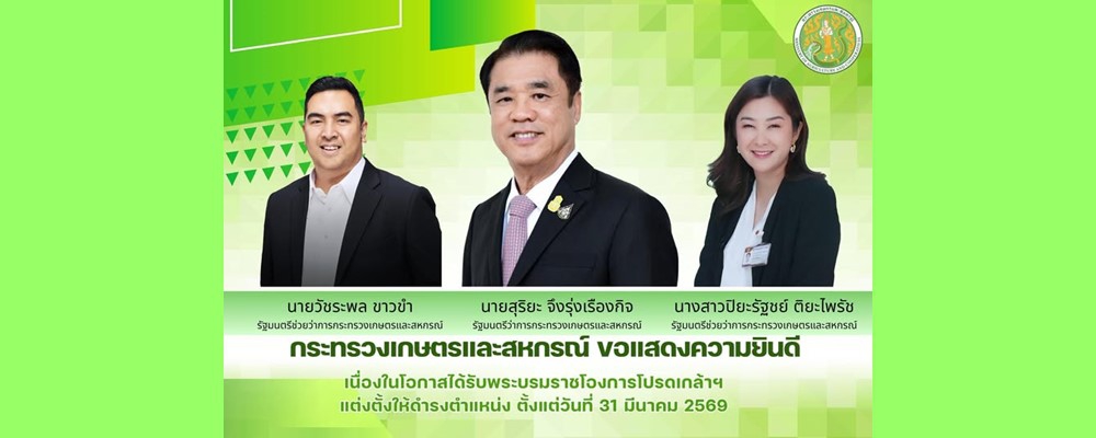 กระทรวงเกษตรและสหกรณ์ ขอแสดงความยินดีอย่างยิ่ง เนื่องในโอกาสที่มีพระบรมราชโองการโปรดเกล้าโปรดกระหม่อมแต่งตั้งให้ดำรงตำแหน่งรัฐมนตรี ตั้งแต่วันที่ ๓๑ มีนาคม พุทธศักราช ๒๕๖๙ นายสุริยะ จึงรุ่งเรืองกิจ รัฐมนตรีว่าการกระทรวงเกษตรและสหกรณ์ นายวัชระพล ขาวขำ รัฐม