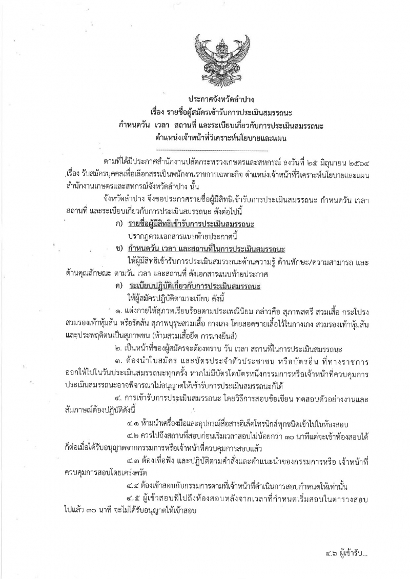 ประกาศจังหวัดลำปาง เรื่อง รายชื่อผู้สมัครเข้ารับการประเมินสมรรถนะ กำหนดวัน เวลา สถานที่ และระเบียบเกี่ยวกับการประเมินสมรรถนะ ตำแหน่งเจ้าหน้าที่วิเคราะห์นโยบายและแผน