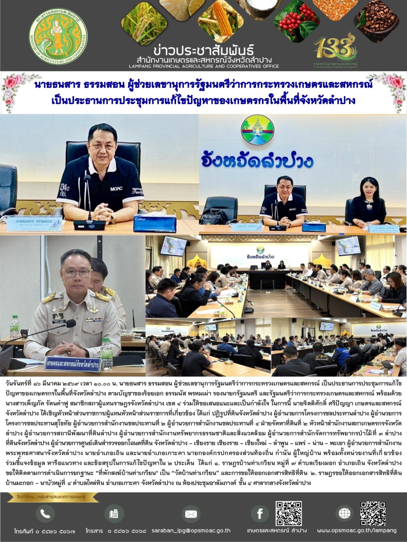 นายธนสาร ธรรมสอน ผู้ช่วยเลขานุการรัฐมนตรีว่าการกระทรวงเกษตรและสหกรณ์ เป็นประธานการประชุมการแก้ไขปัญหาของเกษตรกรในพื้นที่จังหวัดลำปาง