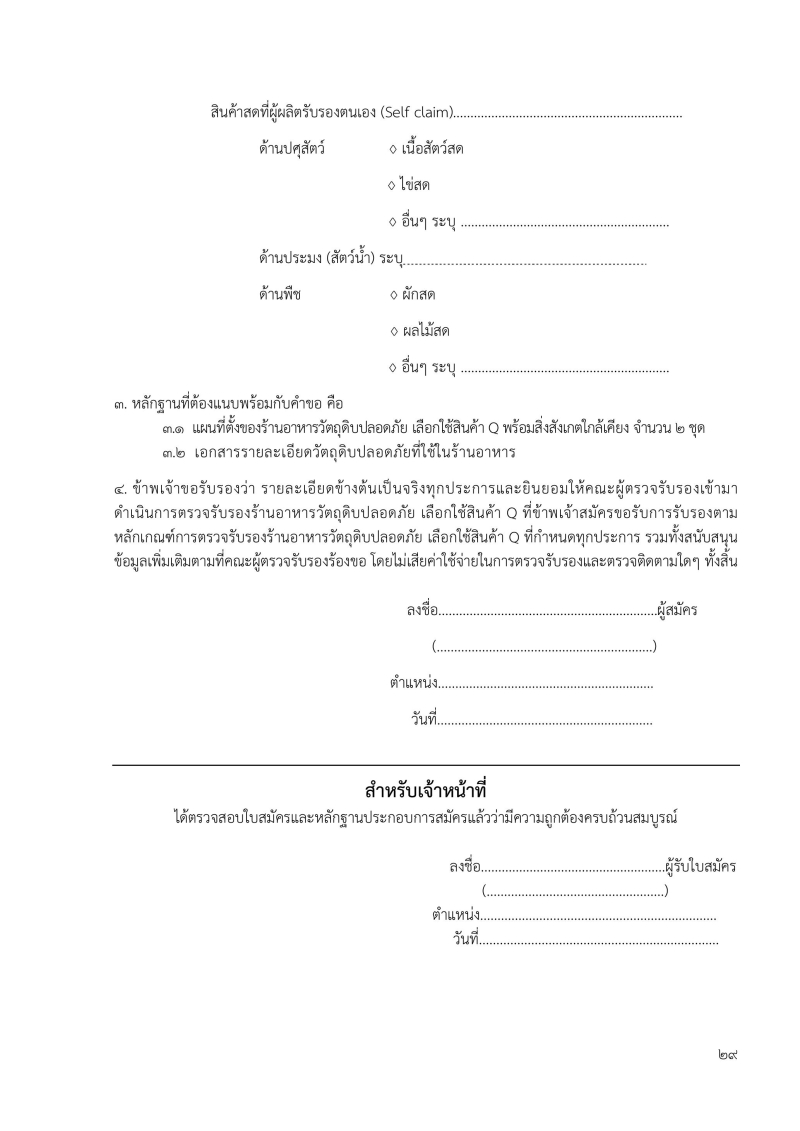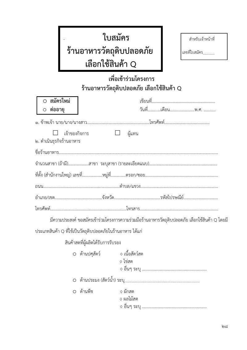 ใบสมัครร้านอาหารวัตถุดิบปลอดภัยเลือกใช้สินค้า Q