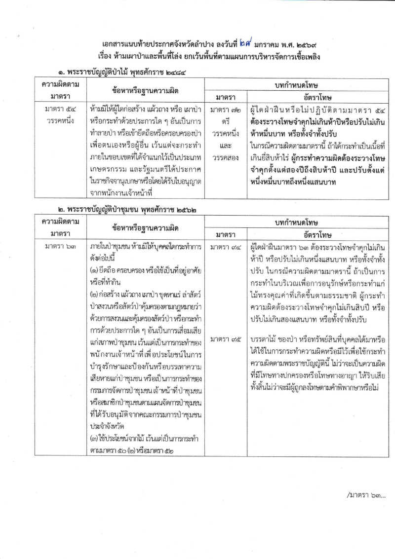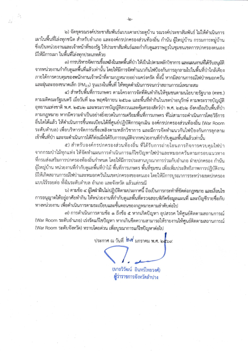 ประกาศจังหวัดลำปาง เรื่อง ห้ามเผาป่าและพื้นที่โล่ง ยกเว้นพื้นที่ตามแผนการบริหารจักดารเชื้อเพลิง