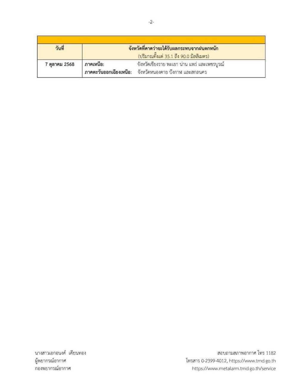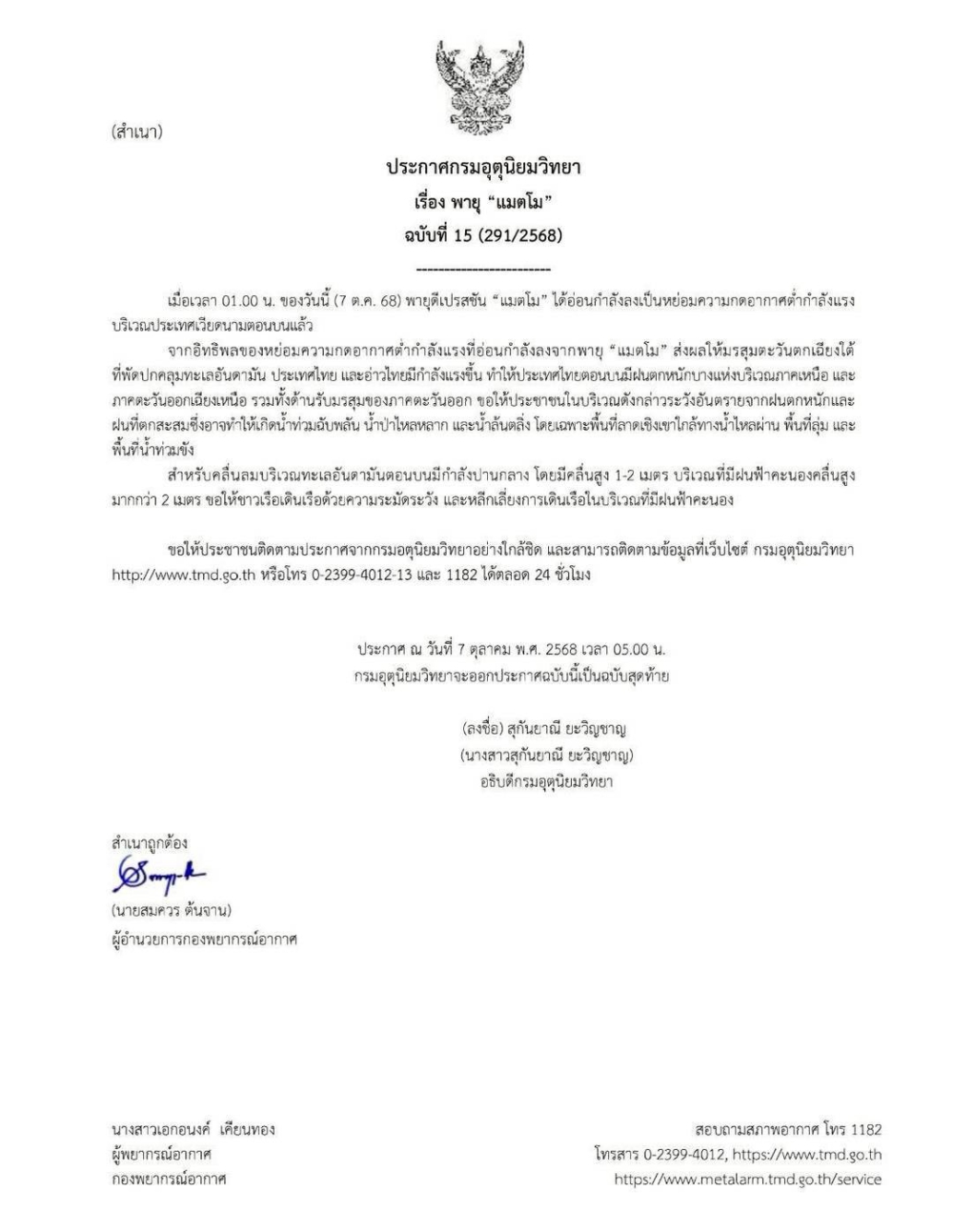ประกาศกรมอุตุนิยมวิทยา เรื่อง พายุ “แมตโม” ฉบับที่ 15 (291/2568)