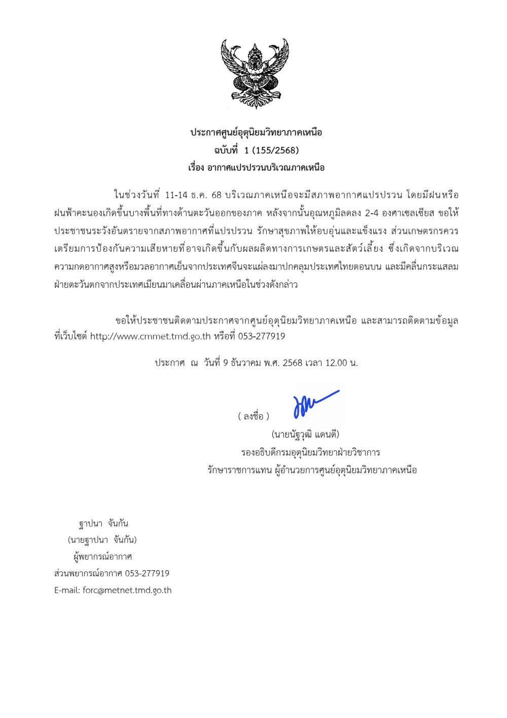ประกาศศูนย์อุตุนิยมวิทยาภาคเหนือ ฉบับที่ 1(155/2568) เรื่อง อากาศแปรปรวณบริเวณภาคเหนือ