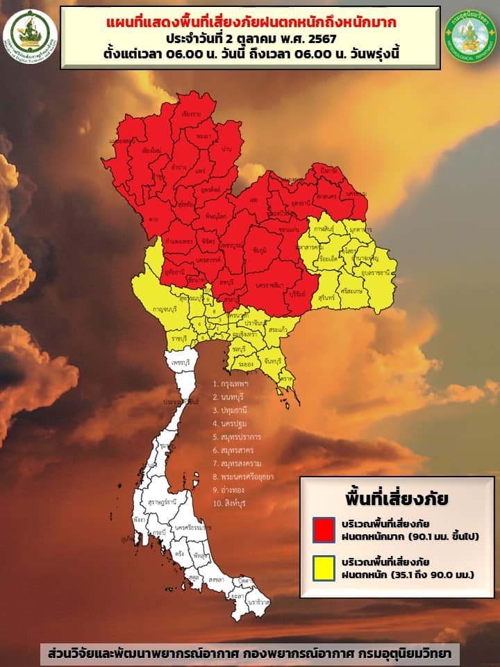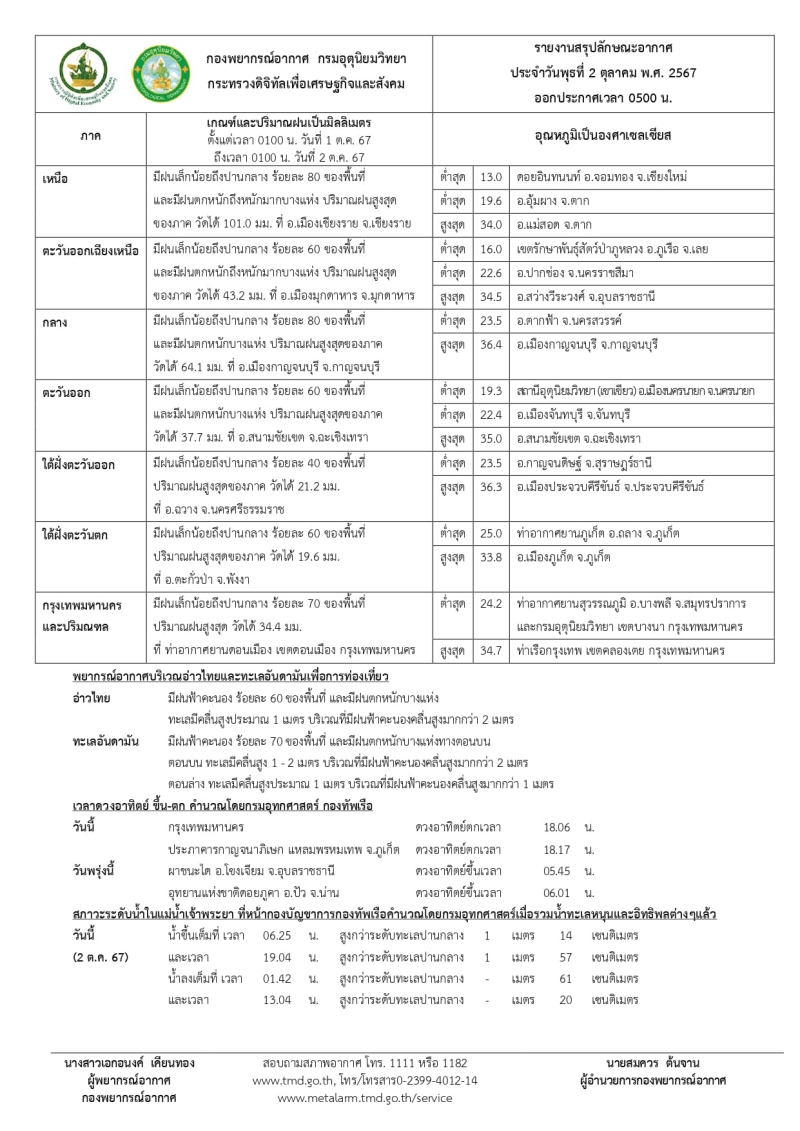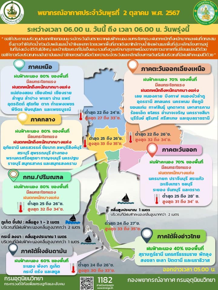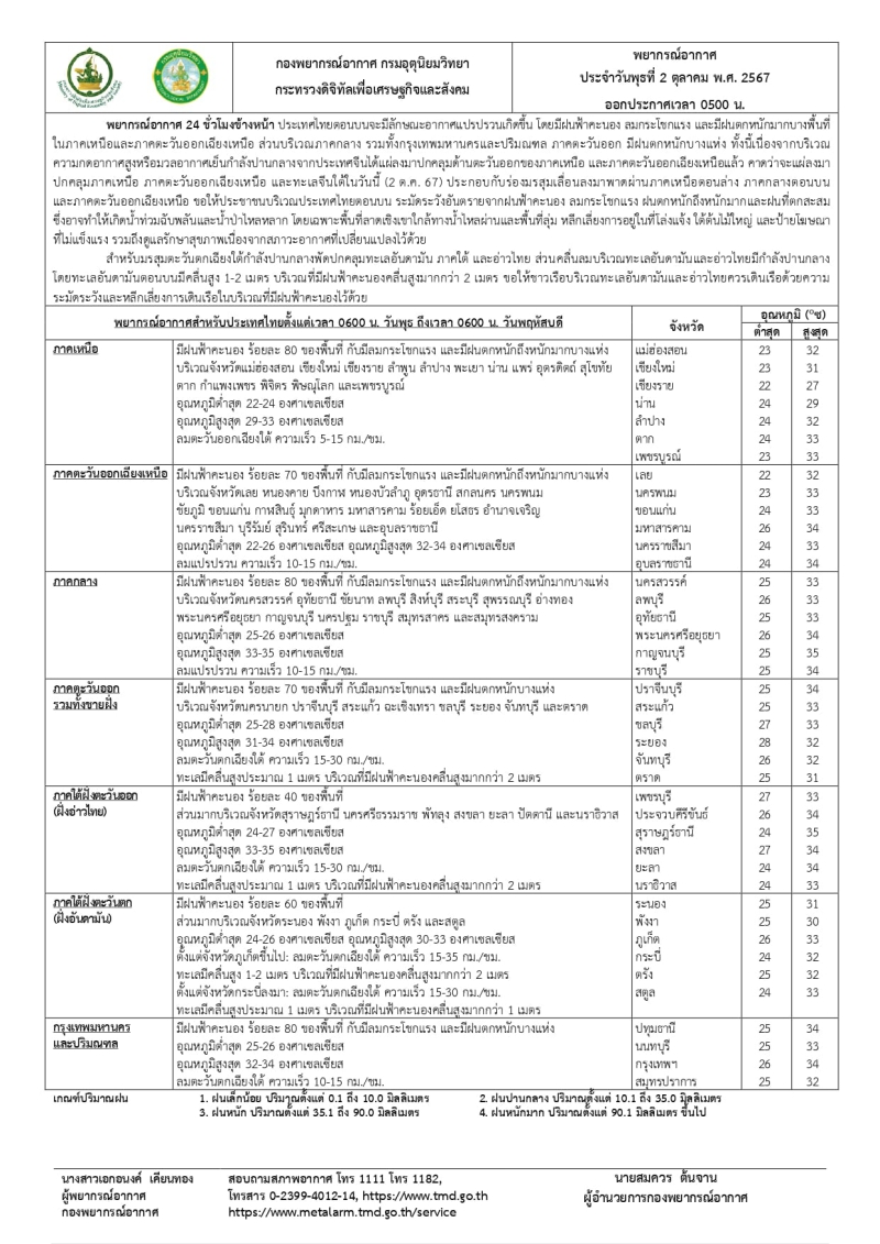 พยากรณ์อากาศประจำวันพุธที่ 2 ตุลาคม 2567 ตั้งแต่เวลา 06.00 น.วันนี้ ถึง 06.00 น. วันพรุ่งนี้