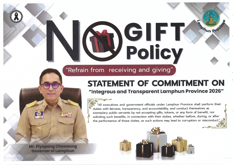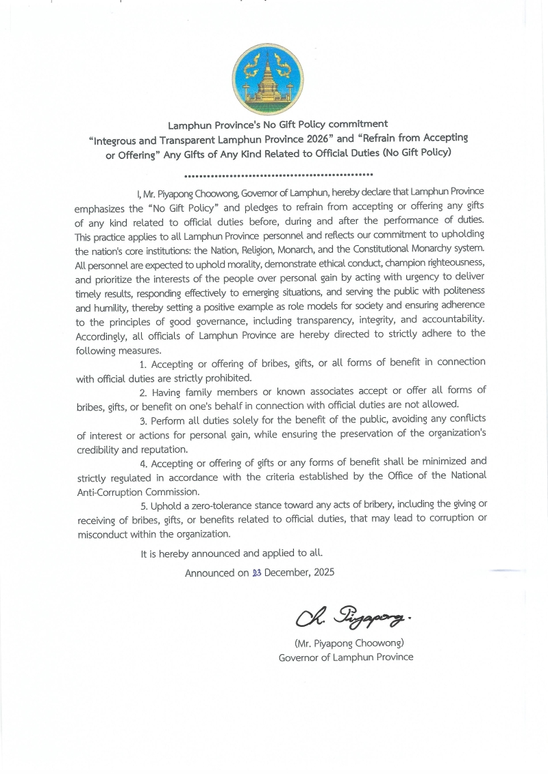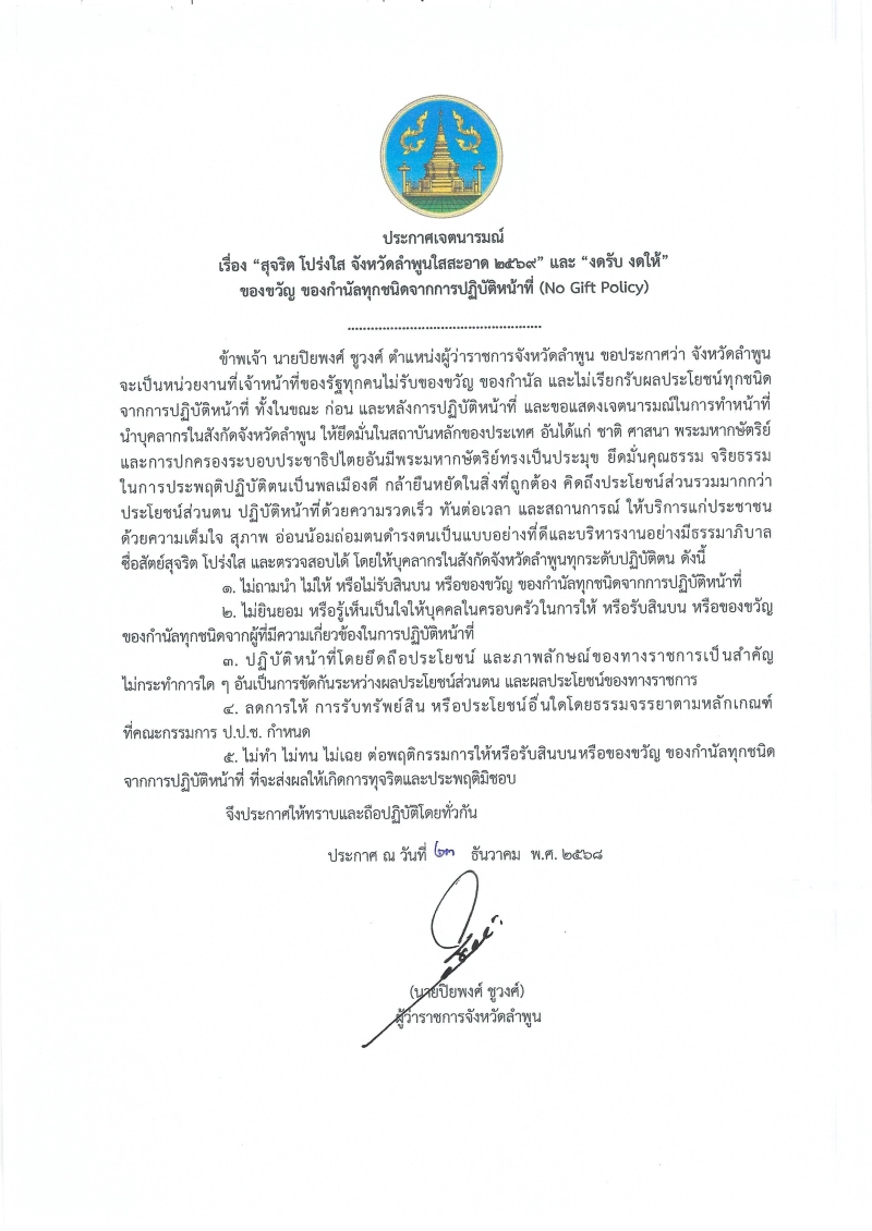 ประกาศเจตนารมณ์ เรื่อง สุจริต โปร่งใส จังหวัดลำพูน ใสสะอาด 2569 และ งดรับ งดให้ ของขวัญ ของกำนัลทุกชนิดจากการปฏิบัติหน้าที่ (No Gift Policy)