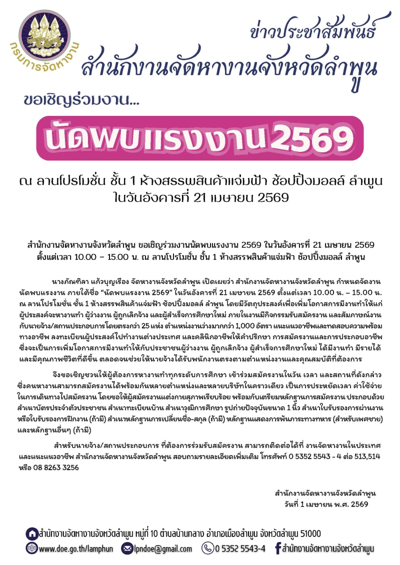 ขอเชิญร่วมงานนัดพบแรงงาน 2569 ในวันอังคารที่ 21 เมษายน 2569 ตั้งแต่เวลา 10.00 – 15.00 น. ณ ลานโปรโมชั่น 1 ห้างสรรพสินค้าแจ่มฟ้า ช้อปปิ้งมอลล์ ลำพูน