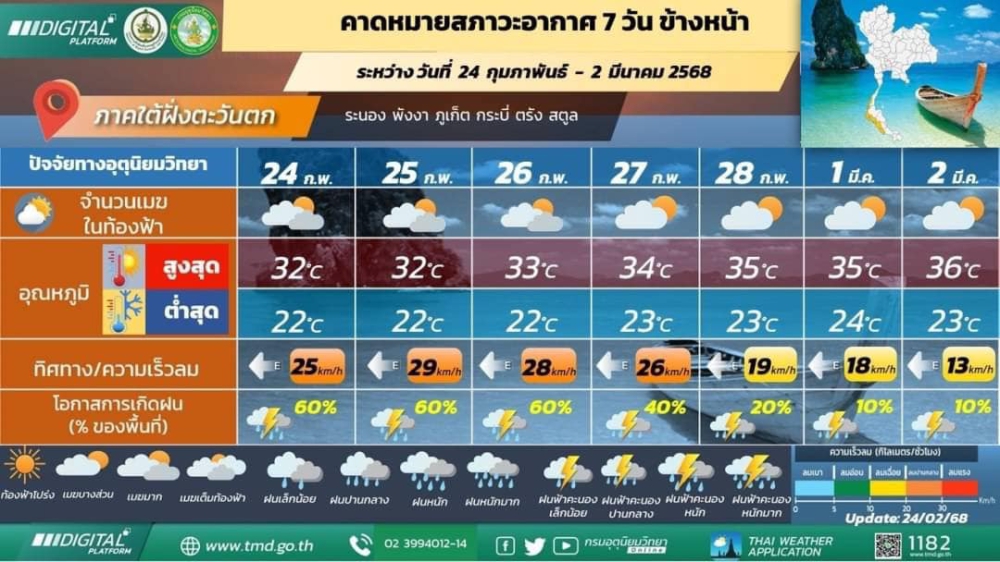 พยากรณ์อากาศ 7 วันข้างหน้า: ในช่วงวันที่ 24 - 25 ก.พ. บริเวณความกดอากาศสูงหรือมวลอากาศเย็นกำลังปานกลางถึงค่อนข้างแรงจากประเทศจีนจะแผ่ลงมาปกคลุมภาคตะวันออกเฉียงเหนือและทะเลจีนใต้ ส่งผลทำให้ยังคงมีลมใต้และลมตะวันออกเฉียงใต้พัดนำความชื้นจากทะเลจีนใต้และอ่าวไทยเข้ามาปกคลุมประเทศไทยตอนบน ประกอบกับจะมีคลื่นกระแสลมฝ่ายตะวันตกจากประเทศเมียนมาเคลื่อนผ่านภาคเหนือ ภาคตะวันออกเฉียงเหนือตอนบน และประเทศลาวตอนบน ในขณะที่ประเทศไทยตอนบนมีอากาศร้อน ลักษณะเช่นนี้ทำให้ประเทศไทยตอนบนจะมีลักษณะอากาศแปรปรวน โดยมีพายุฝนฟ้าคะนอง ลมกระโชกแรง และลูกเห็บตกบางแห่ง รวมถึงฟ้าผ่าที่อาจเกิดขึ้นได้บางพื้นที่เกิดขึ้นในระยะแรก หลังจากนั้นอุณหภูมิจะลดลง 1 – 3 องศาเซลเซียสในภาคตะวันออกเฉียงเหนือ ส่วนภาคเหนือตอนล่าง ภาคกลาง รวมทั้งกรุงเทพมหานครและปริมณฑล และภาคตะวันออก อุณหภูมิจะลดลง 1 – 2 องศาเซลเซียส สำหรับมรสุมตะวันออกเฉียงเหนือและลมตะวันออกที่พัดปกคลุมอ่าวไทย ภาคใต้ และทะเลอันดามันจะเริ่มมีกำลังแรงขึ้น ทำให้ภาคใต้มีฝนเพิ่มขึ้น และมีฝนตกหนักถึงหนักมากบางแห่ง ส่วนคลื่นลมบริเวณอ่าวไทยและทะเลอันดามันจะมีกำลังแรงขึ้น โดยอ่าวไทยตอนล่างมีคลื่นสูง 2 – 3 เมตร บริเวณทีมีฝนฟ้าคะนองคลื่นสูงมากกว่า 3 เมตร อ่าวไทยตอนบนคลื่นสูงประมาณ 2 เมตร ทะเลอันดามันคลื่นสูง 1 – 2 เมตร บริเวณที่มีฝนฟ้าคะนองคลื่นสูงมากกว่า 2 เมตร