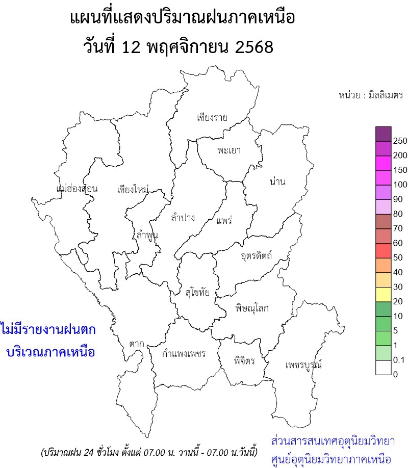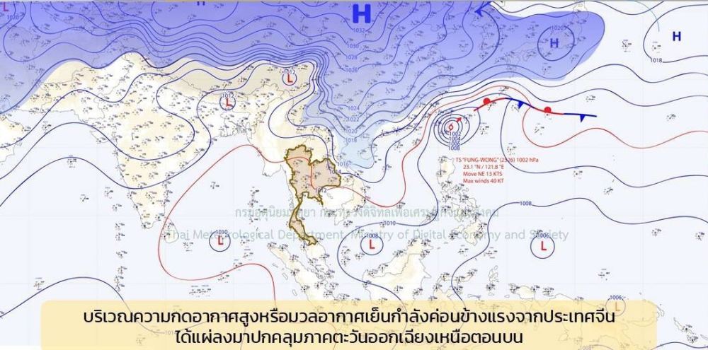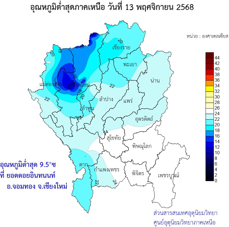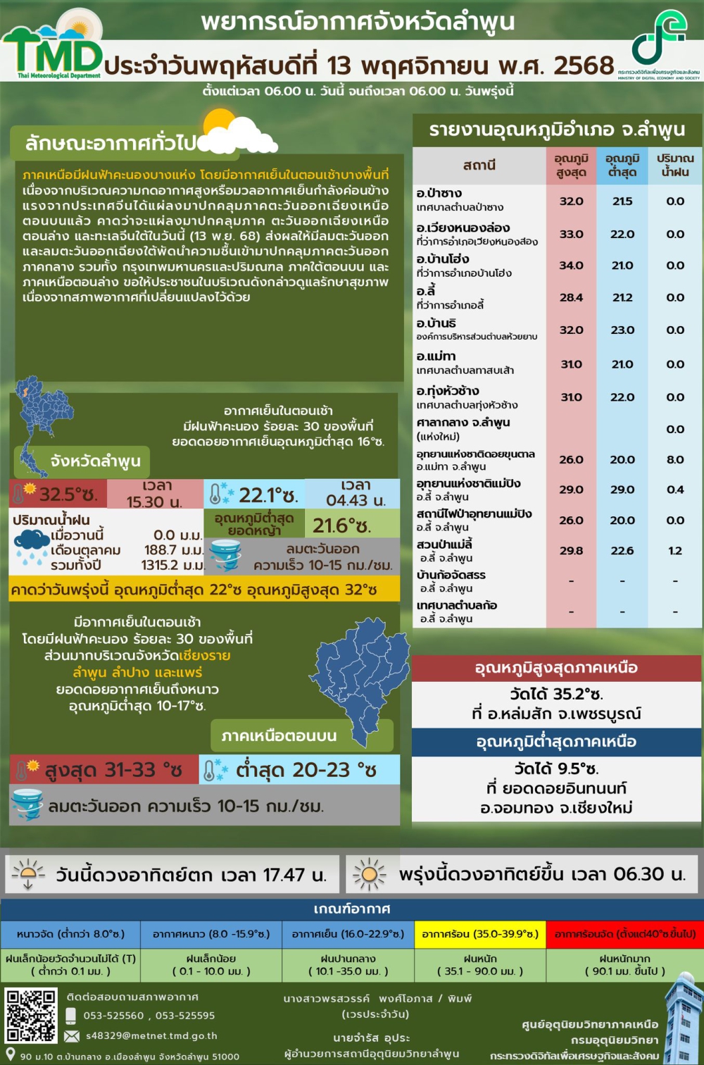 ภาคเหนือมีฝนฟ้าคะนองบางแห่ง โดยมีอากาศเย็นในตอนเช้าบางพื้นที่ เนื่องจากบริเวณความกดอากาศสูงหรือมวลอากาศเย็นกําลังค่อนข้างแรงจากประเทศจีนได้แผ่ลงมาปกคลุมภาคตะวันออกเฉียงเหนือตอนบนแล้ว คาดว่าจะแผ่ลงมาปกคลุมภาค ตะวันออกเฉียงเหนือตอนล่าง และทะเลจีนใต้ในวันนี้ (13 พ.ย. 68) ส่งผลให้มีลมตะวันออก และลมตะวันออกเฉียงใต้พัดนําความชื้นเข้ามาปกคลุมภาคตะวันออก ภาคกลาง รวมทั้ง กรุงเทพมหานครและปริมณฑล ภาคใต้ตอนบน และภาคเหนือตอนล่าง ขอให้ประชาชนในบริเวณดังกล่าวดูแลรักษาสุขภาพเนื่องจากสภาพอากาศที่เปลี่ยนแปลงไว้ด้วย