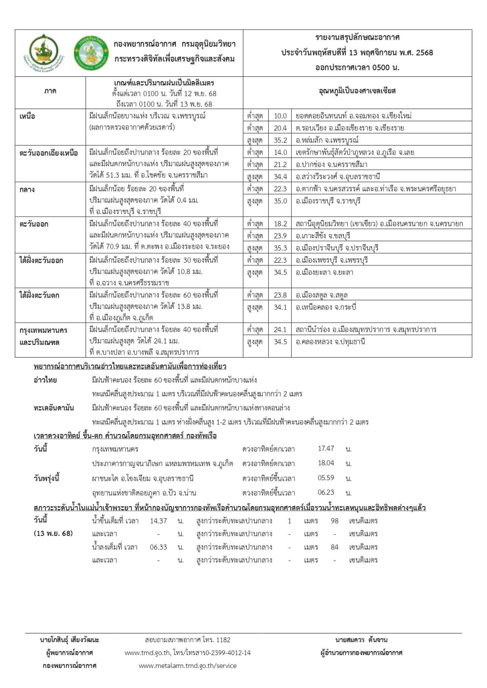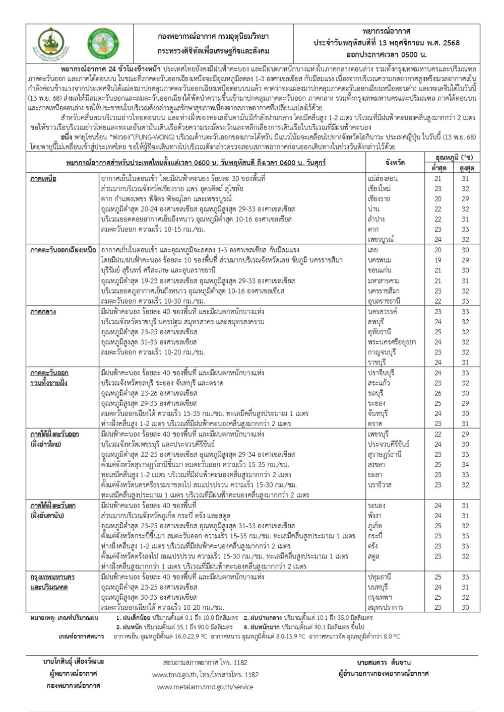 กราฟิกพยากรณ์อากาศรายภาคและแผนที่พื้นที่เสี่ยงภัยฝนตกหนักถึงหนักมากบริเวณประเทศไทย ประจำวันที่ 13 พฤศจิกายน 2568 เวลา 06.00 น.