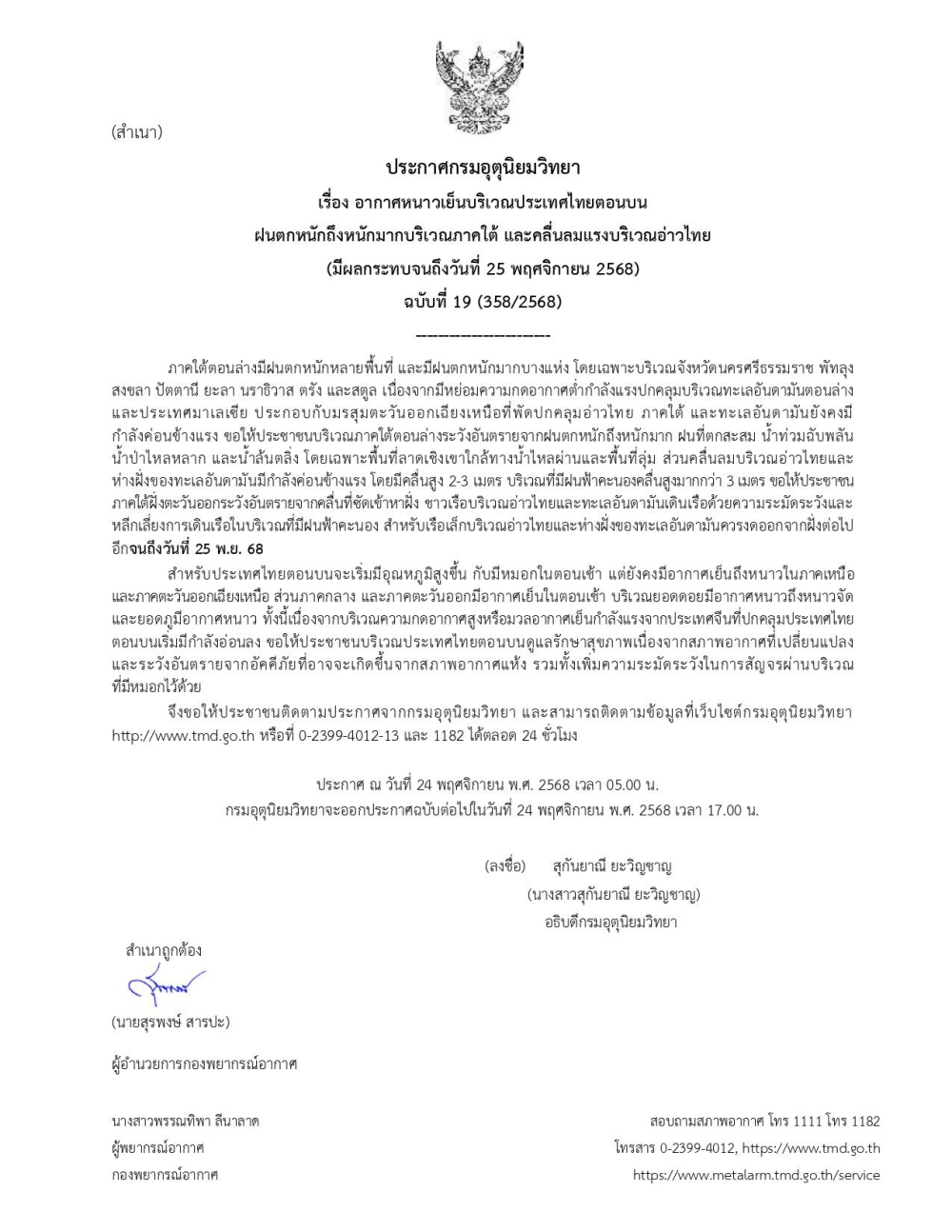 ประกาศกรมอุตุนิยมวิทยา เรื่อง อากาศหนาวเย็นบริเวณประเทศไทยตอนบน ฝนตกหนักถึงหนักมากบริเวณภาคใต้ และคลื่นลมแรงบริเวณอ่าวไทย (มีผลกระทบจนถึงวันที่ 25 พฤศจิกายน 2568) ฉบับที่ 19 (358/2568