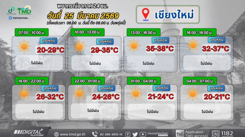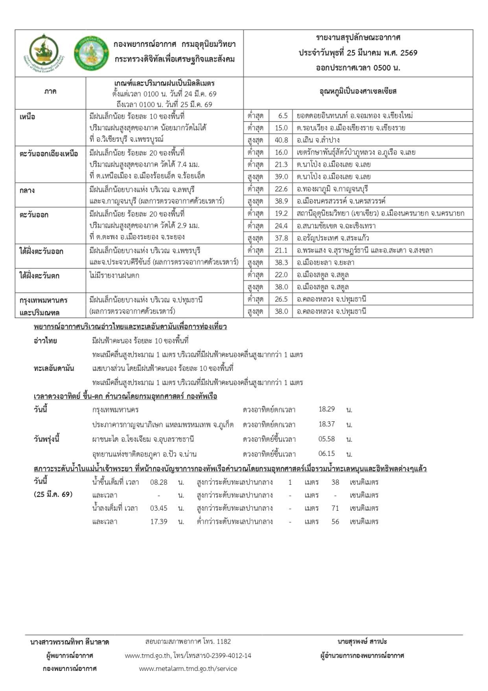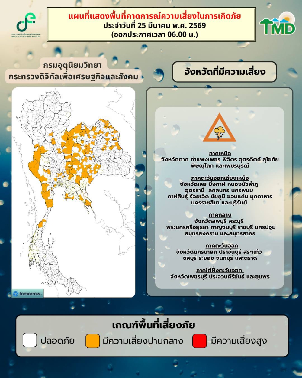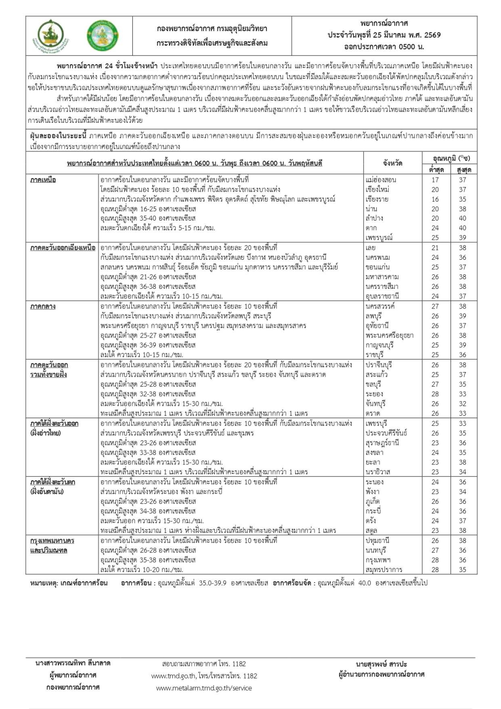 พยากรณ์อากาศรายภาคพร้อมแผนที่พื้นที่คาดการณ์ความเสี่ยงในการเกิดภัย ประจำวันที่ 25 มีนาคม 2569 เวลา 05.00 น.
