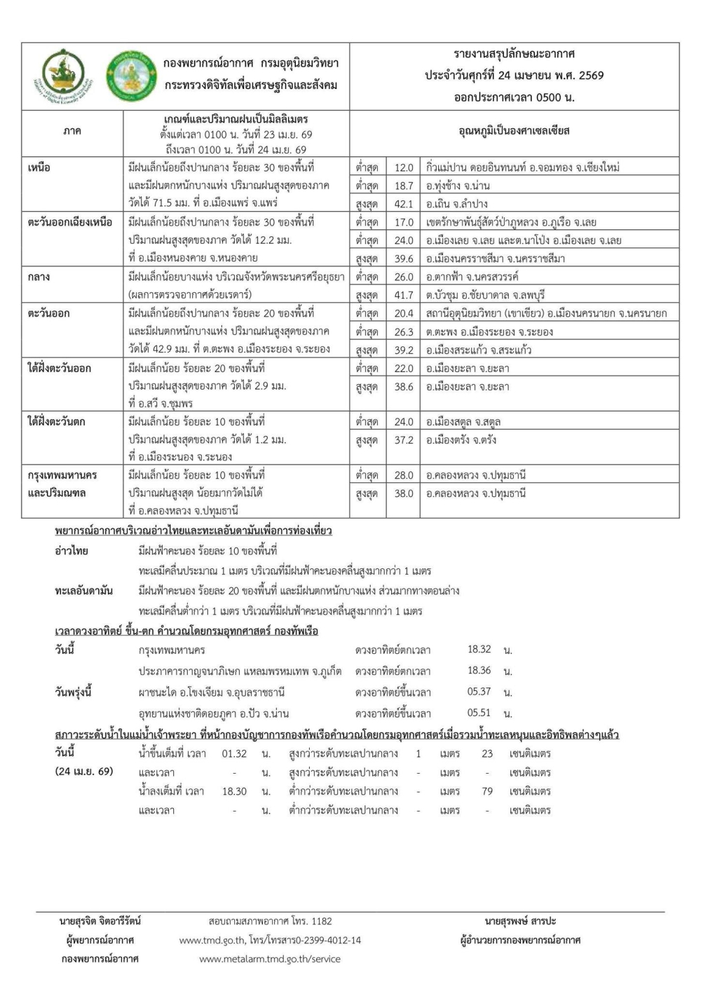 ประกาศกรมอุตุนิยมวิทยา เรื่อง พายุฤดูร้อนบริเวณประเทศไทยตอนบน (มีผลกระทบตั้งแต่วันที่ 24-25 เมษายน 2569) ฉบับที่ 5 (37/2569)