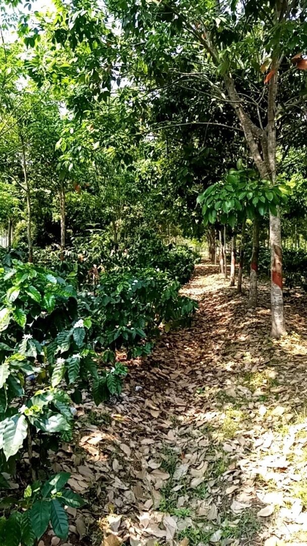 ที่ไร่กาแฟนายจันทร์ เราปลูกกาแฟแซมในสวนยางพารา ปลูกในระยะห่างระหว่างต้นประมาณ 1-1.50 เมตร มีระบบการจัดการน้ำ 2 รูปแบบ คือ ระบบน้ำหยด เพื่อรักษาความชื้นในดิน และ ระบบสปริงเกลอร์ เพื่อรักษาความชื้นในอากาศ หากวันไหนแดดจัดมากเราจะจ่ายน้ำสปริงเกลอร์เพื่อป้องกันไม่ให้ใบร่วงในจุดที่ร่มเงาไม่เพียงพอ โดยเราจะเช็กสภาพอากาศวันต่อวัน เพื่อเลือกใช้ระบบน้ำให้เหมาะสมที่สุด
